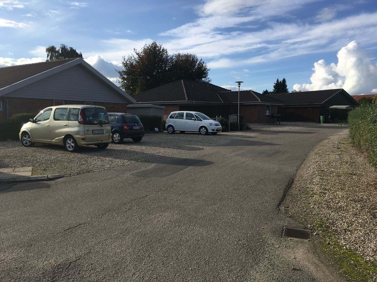 Foto fra indkørslen til Enebærvej, der viser parkering langs med vejen og i baggrunden ligger ejendommen på Enebærvej 3.