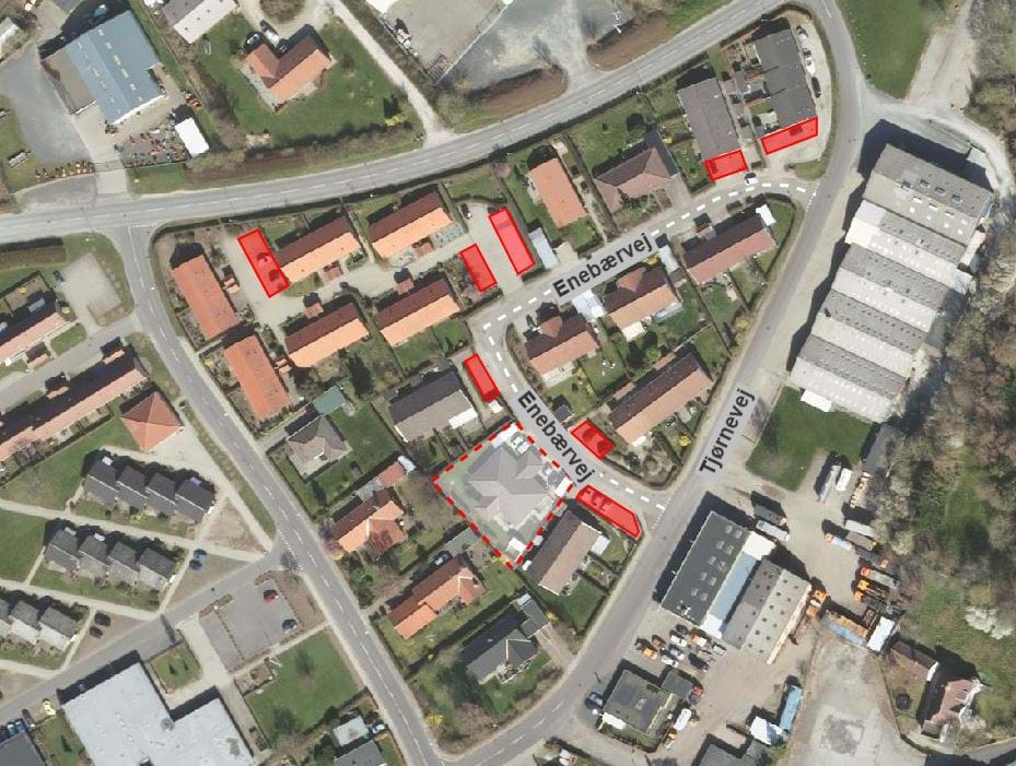 Oversigtskort, der illustrerer placeringen af rækkehusenes parkeringsområder langs med Enebærvej.