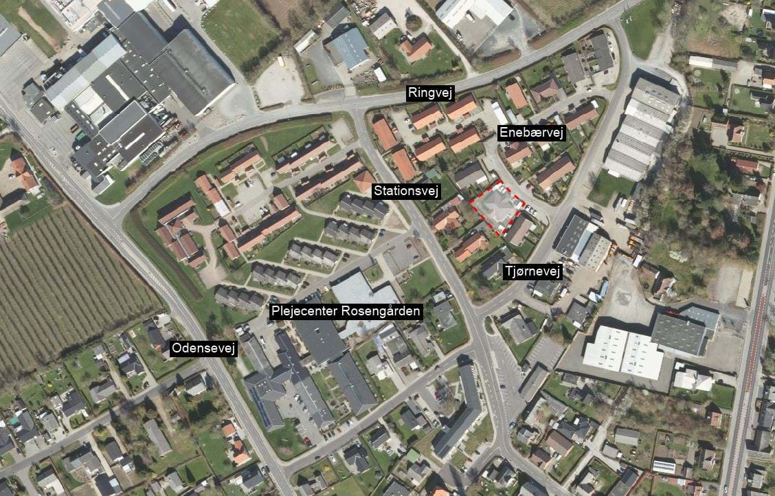 Oversigtskort, der viser det eksisterende boligområde i Ørbæk og plejecenter Rosengården. Herudover markering af ejendommen, Enebærvej 3, som nærværende lokalplan omfatter.
