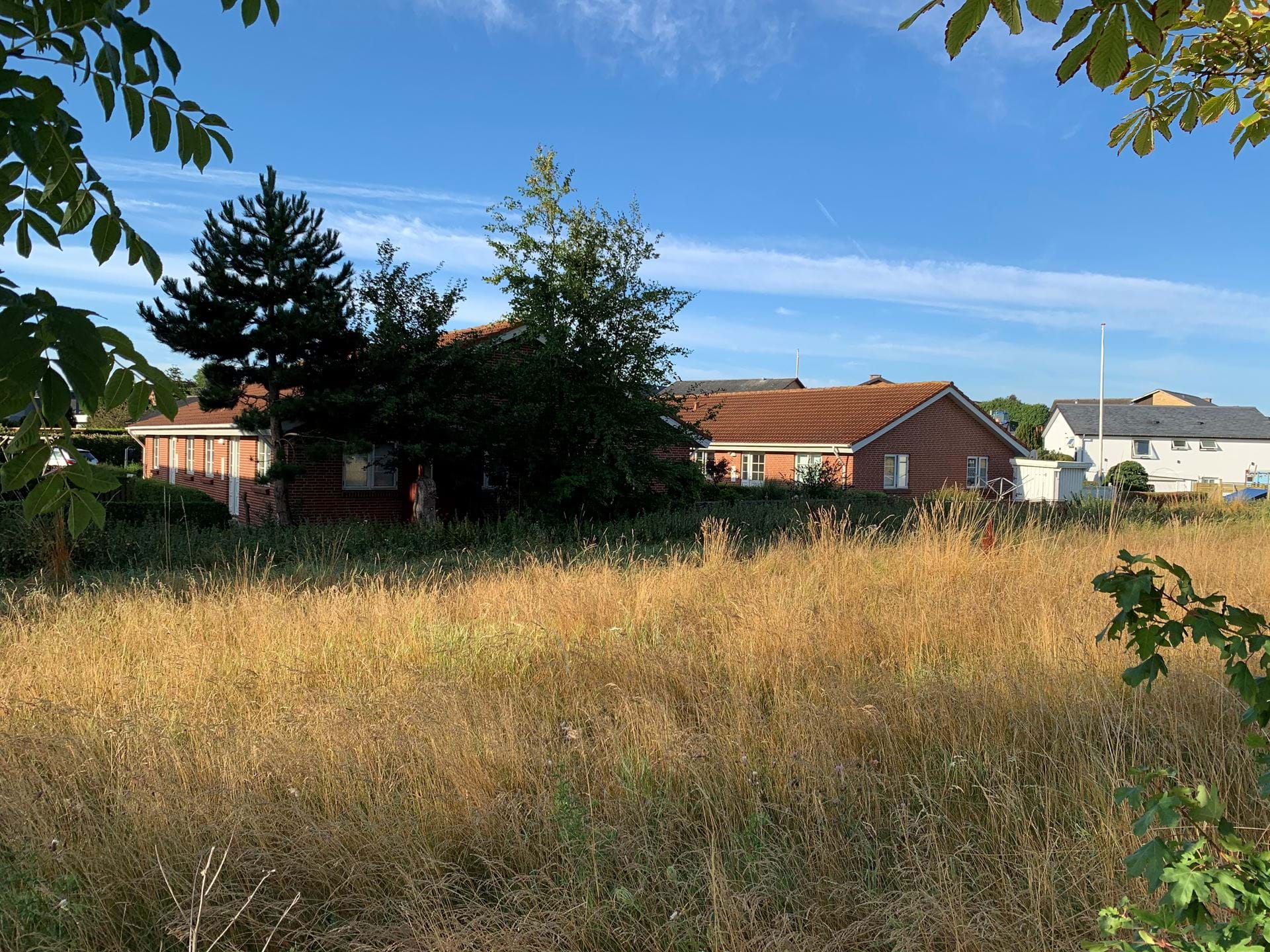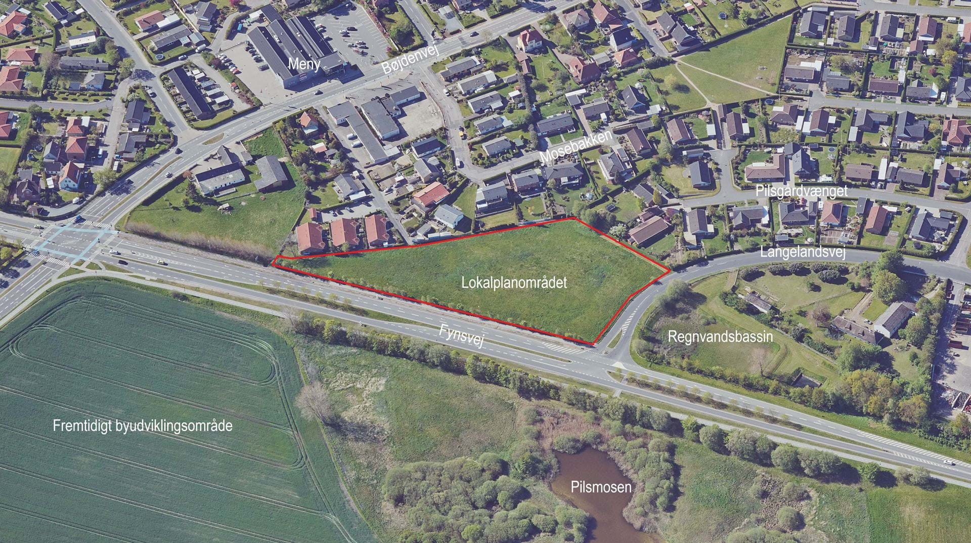 Figur 3: Planområdet set fra Fynsvej/Langelandsvej. I baggrunden ses boligerne ved Mosebakken og Pilsgårdvænget.