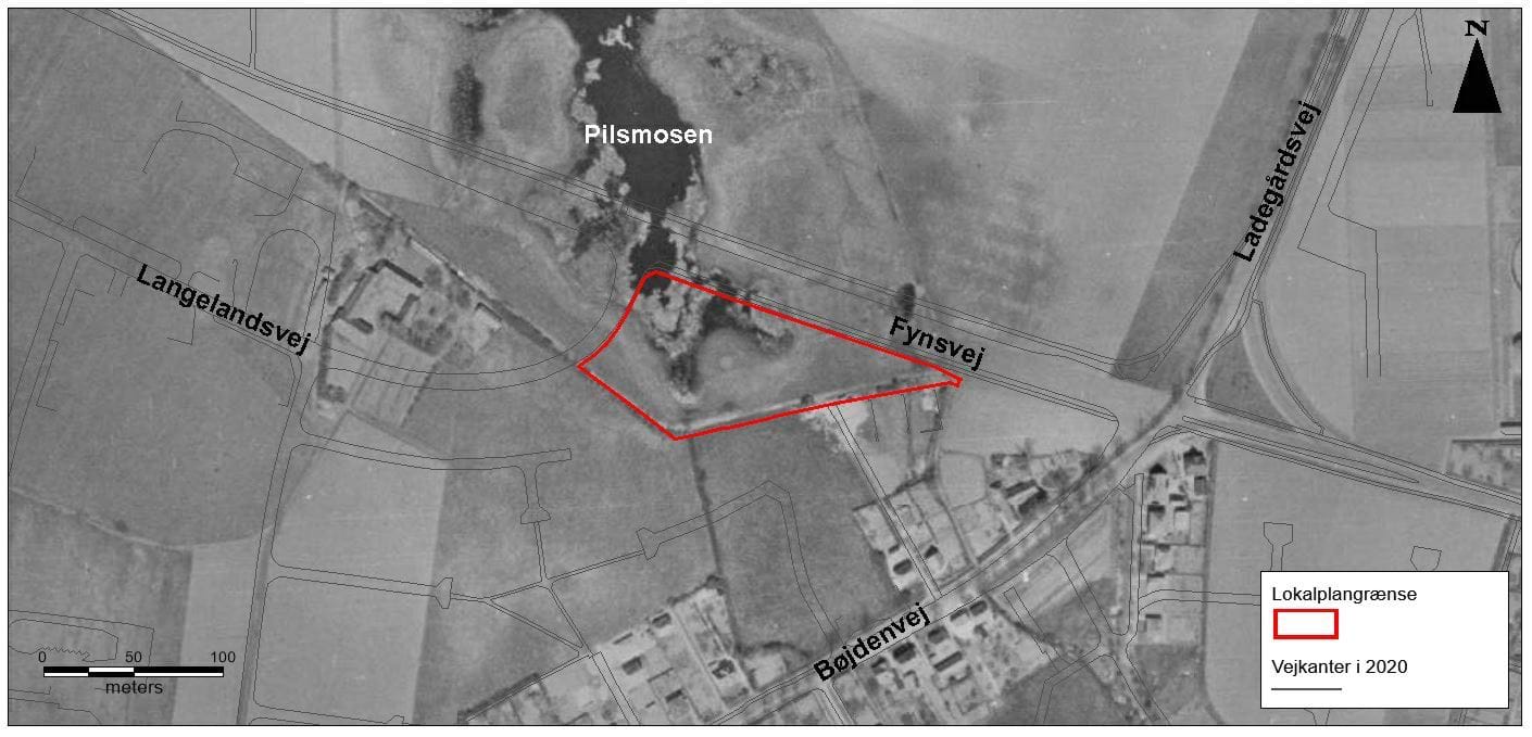 Figur 5: På dette luftfoto fra 1954 er lokalplanområdets afgrænsning indtegning sammen med omridset af veje i 2020. Det ses af luftfotoet, at det, der i dag er en mindre eng i udkanten af Nyborg by, i 1954 var del af Pilsmosen, og at byen endnu ikke er nået helt herud.