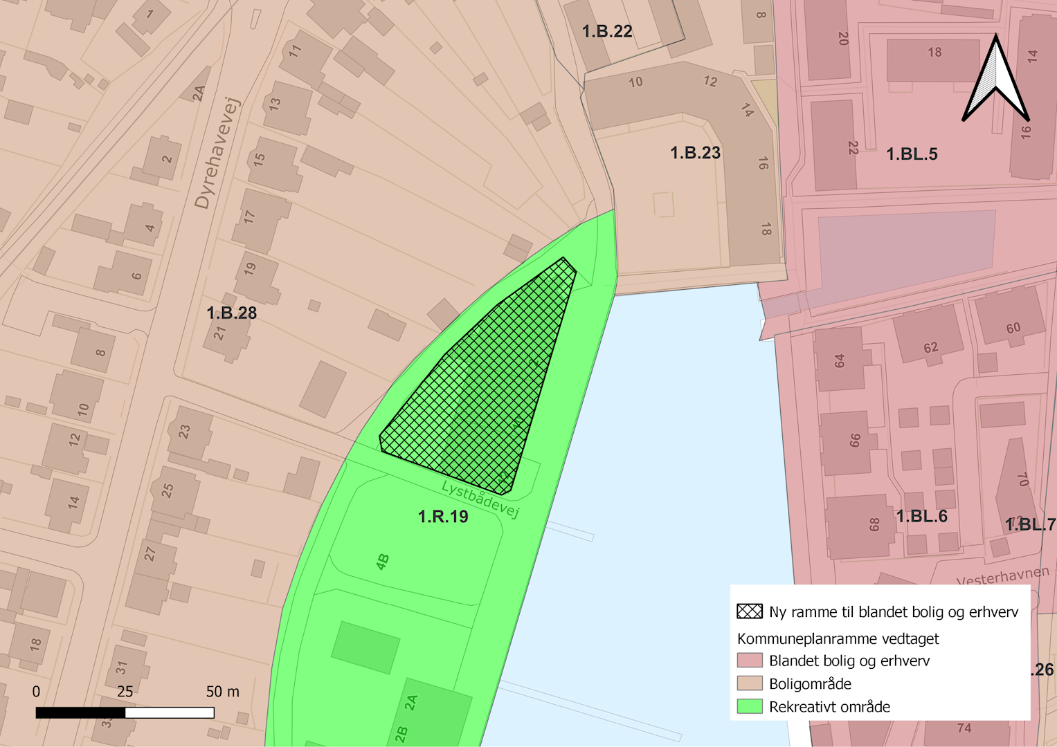 Figur 8: Nyt rammeområde til blandet bolig og erhverv. Det nye rammeområde erstatter en del af den gældende ramme 1.R.19, der omfatter hele marinaområdet vest for inderhavnen.