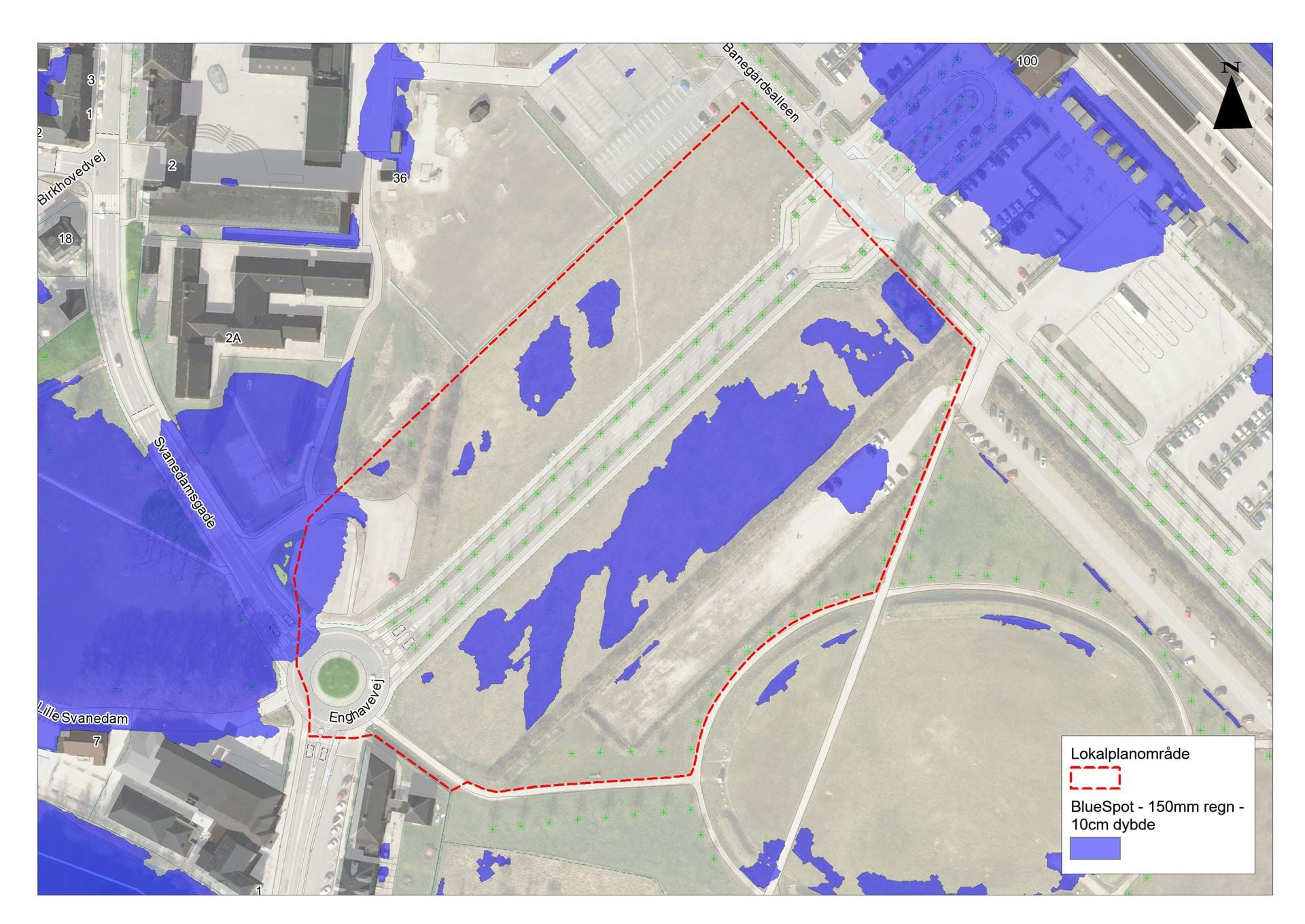 Figur: Områder, hvor der samles vand i tilfælde af kraftige regnskyld (bluespots). Her vist som områder, hvor der står 10 cm vand efter et 150mm regnskyld. En stor del af den sydlige del af planområdet vil være ramt af oversvømmelse i sådan et tilfælde.