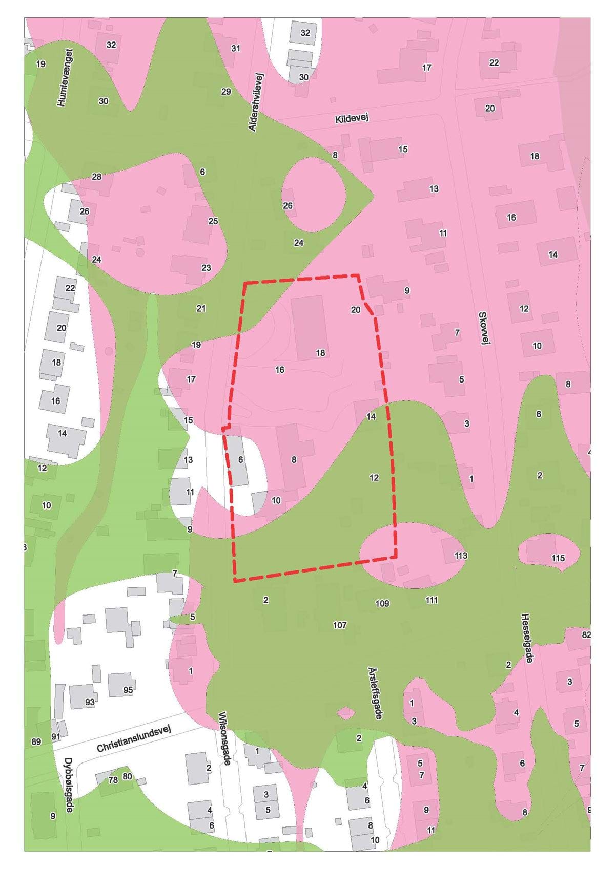 Figur: Grøn farve illustrerer støj fra jernbane, mens pink illustrerer støjen fra Fynske Motorvej. Lokalplanområdet påvirkes med 58-63 dB fra Fynske Motorvej, og 58-63 dB fra jernbanen