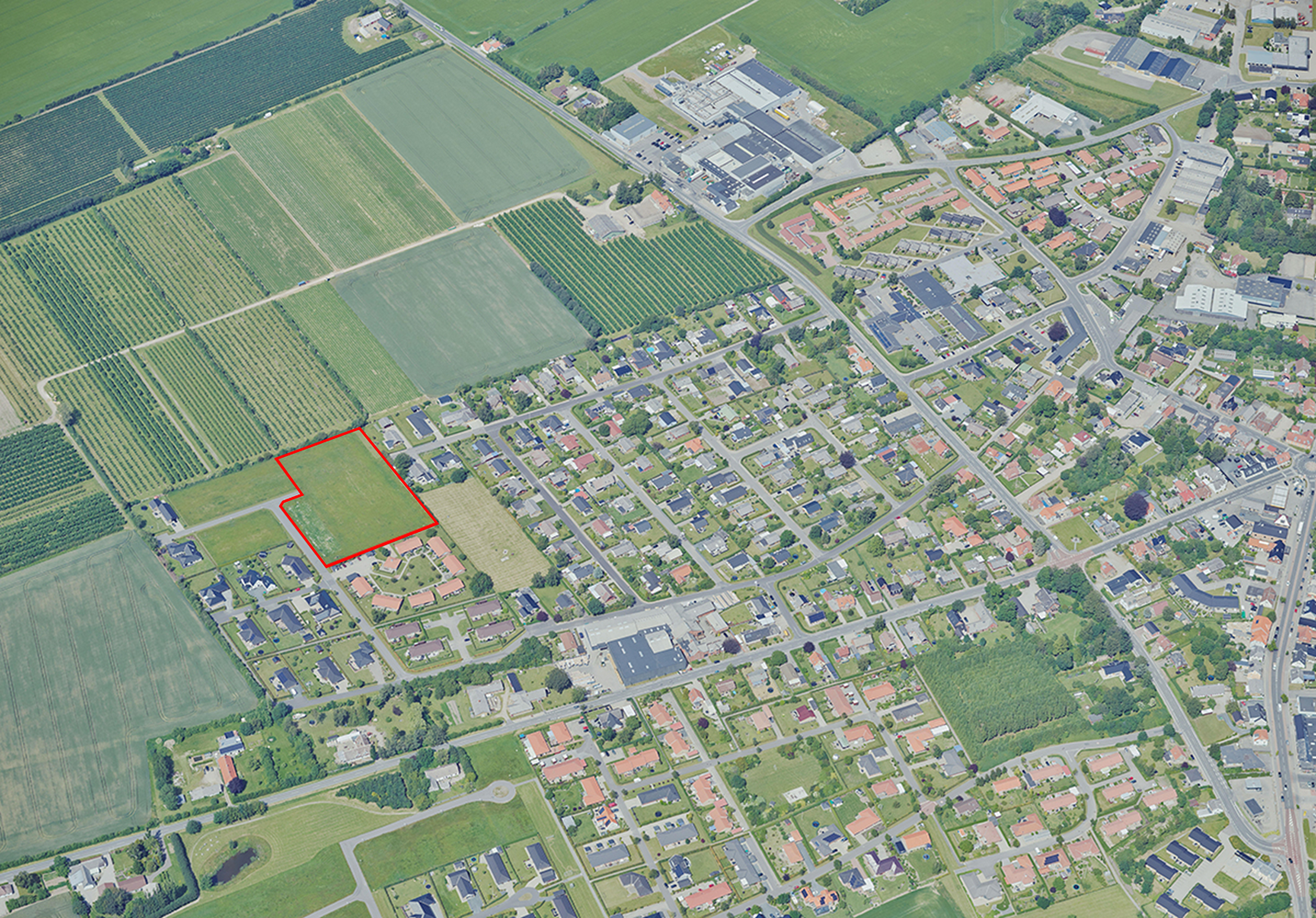 Skråfoto af lokalplanområdet, der er markeret med rød ramme.
