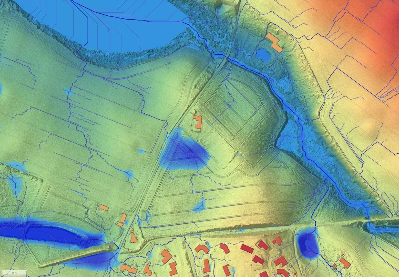 Del af lokalplanområdet er berørt af blue-spot registrering og er således potentielt udfordret i forhold til skybrudshændelser. Den nordvestlige del af matr.nr. 12e, Vindinge By, Vindinge ligger som en del af en stor lavning, der ved ekstreme regnvandshændelser vil modtage vand og fyldes op, før vandet løber videre mod recipienten Ladegård Å. Lavningens saddelpunkt udgøres af Lindenborgvej, hvor vandet vil skulle løbe over for at komme videre ud af området. Områdets blue spot registrering, lavninger og vandets forløb er illustreret af nedenstående kort.
