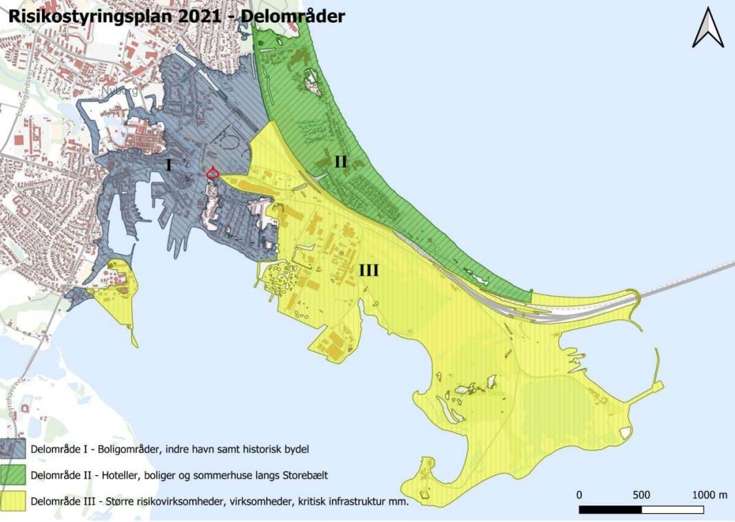 Lokalplanområdet er beliggende indenfor udpeget område for Risikostyringsplan for Nyborg for oversvømmelse fra hav. Planområdet ligger indenfor delområde 1 (blå skravering).