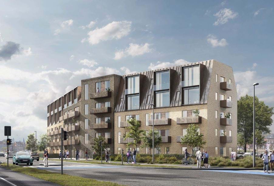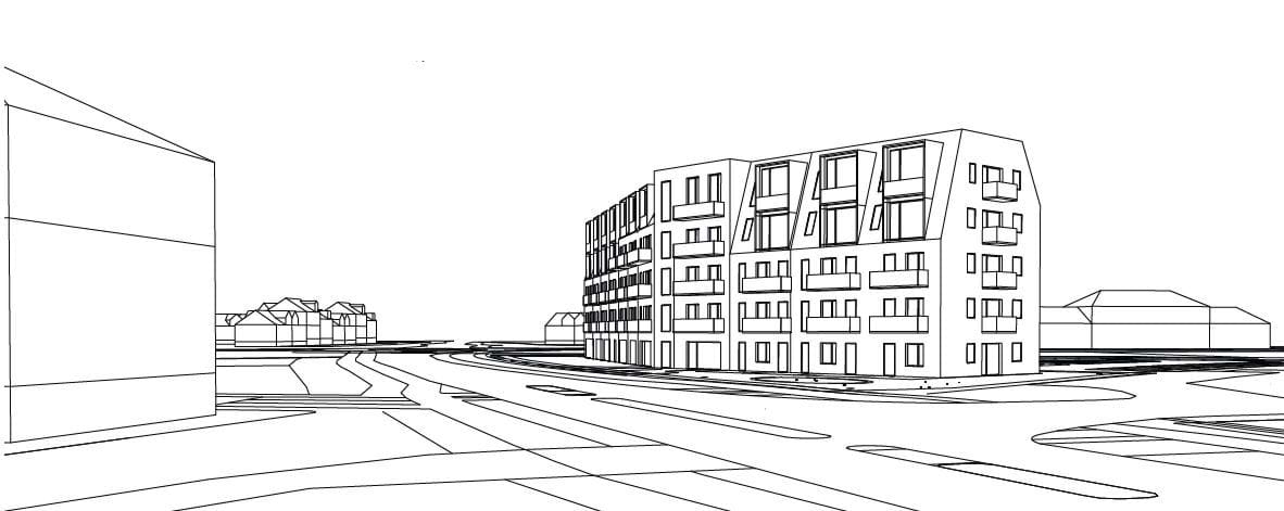 Illustration af etagebyggeri i fem etager set fra Storebæltsvej i retning mod bymidten.