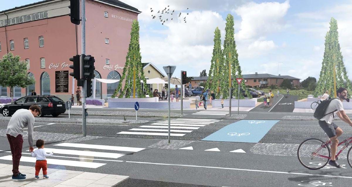 Illustration fra et byrumsprojekt for omdannelse af Storebæltsvej fra indfaldsgade til bygade. Illustrationen giver et bud på, hvordan zonen mellem Storebæltsvej og ny bebyggelse kan aktiveres med eksempelvis pladsdannelse, publikumsorienterede funktioner og mere grønt. I byrumsprojektet har man taget udgangspunkt i den eksisterende bebyggelse på Bryggerivej.