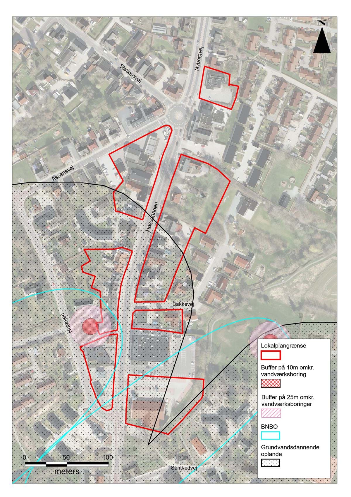 Lokalplanområdet ligger i område med særlige drikkevandsinteresser (OSD). Områder med særlige drikkevandsinteresser skal friholdes for virksomhedstyper eller anlæg, der medfører en væsentlig fare for forurening af grundvandet.Området ligger desuden inden for grundvandsdannende indvindingsopland. Størstedelen af lokalplanområdet ligger mindre end 300 m fra grundvandsboringer ved Hulvejen og Sentvedvej. En større del af den sydlige del af lokalplanområdet ligger inden for BNBO for disse boringer. Boringsnære beskyttelsesområder til almene vandforsyninger skal friholdes for udlæg af nye arealer til en arealanvendelse, der medfører øget fare for forurening af grundvandet. Dette kan fraviges, hvis det er godtgjort, at der er en særlig planlægningsmæssig begrundelse for placeringen, herunder at lokalisering uden for de nævnte områder er undersøgt og ikke fundet mulig, og at faren for forurening af grundvandet kan forebygges. Lokalplanområdet overlapper delvis med 10 og 25 m buffer omkring boring ved Hulvejen. Indenfor en radius på 25 m omkring vandværkernes indvindingsboringer må der ikke gødes, dyrkes eller bruges pesticider til erhvervsmæssige eller offentlige formål. Indenfor en radius på mindst 10 meter omkring indvindingsboringer til almene vandforsyninger må der ikke drives virksomhed eller ske oplag eller brug af stoffer, produkter eller materialer, der kan forurene grundvandet. Se oversigtskort nedenfor.