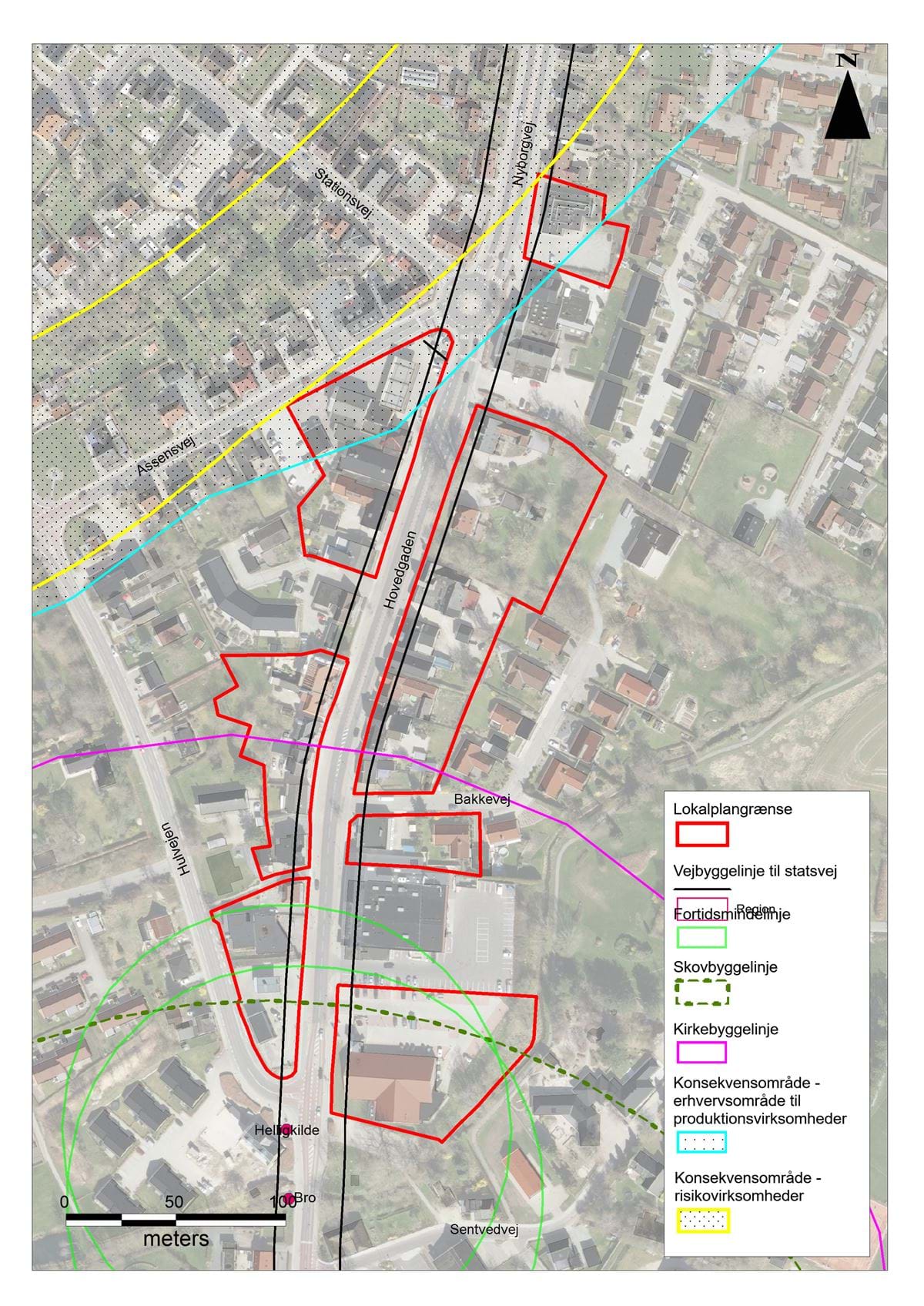 Figur: Afgrænsning af relevante plan- og beskyttelsesforhold: Beskyttelseslinjer efter naturbeskyttelsesloven og konsekvenszoner omkring risikovirksomheder og områder til produktionsvirksomheder.