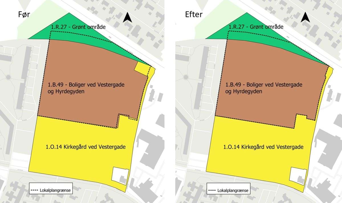 Kommuneplantillægget ændrer desuden på den geografiske afgrænsning mellem rammen til kirkegård og rammen til boligformål, således at boligrammen afgrænses mere hensigtsmæssigt i forhold til den aktuelle planlægning. Rammen til rekreative område forbliver uændret. Der henvises til kortene herunder.
