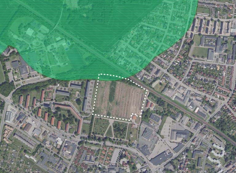 Kortet viser lokalplanområdet sammenholdt med skovbyggelinjen. Skovbyggelinjen berører en mindre del af områdets nordvestlige hjørne.