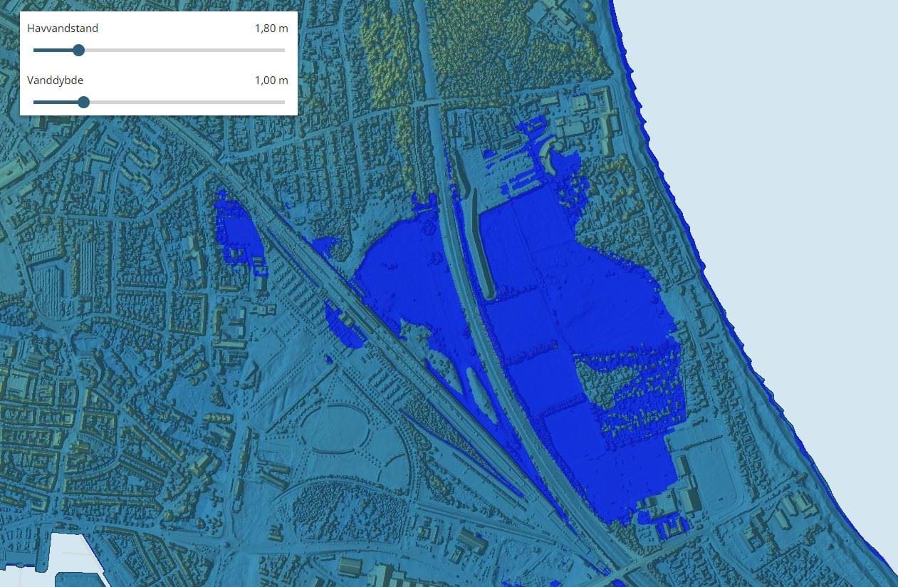 Skybrudskort. Ved nedbør på 25 mm kan der stå ca. 50 cm vand på terræn. Kilde: SCALGO Live.