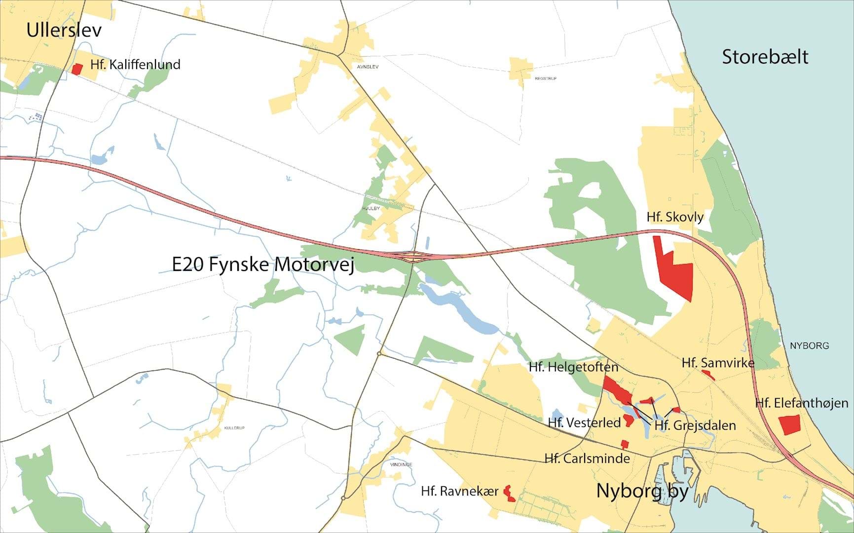 Kort over Nyborg Kommunes kolonihaveforeninger.