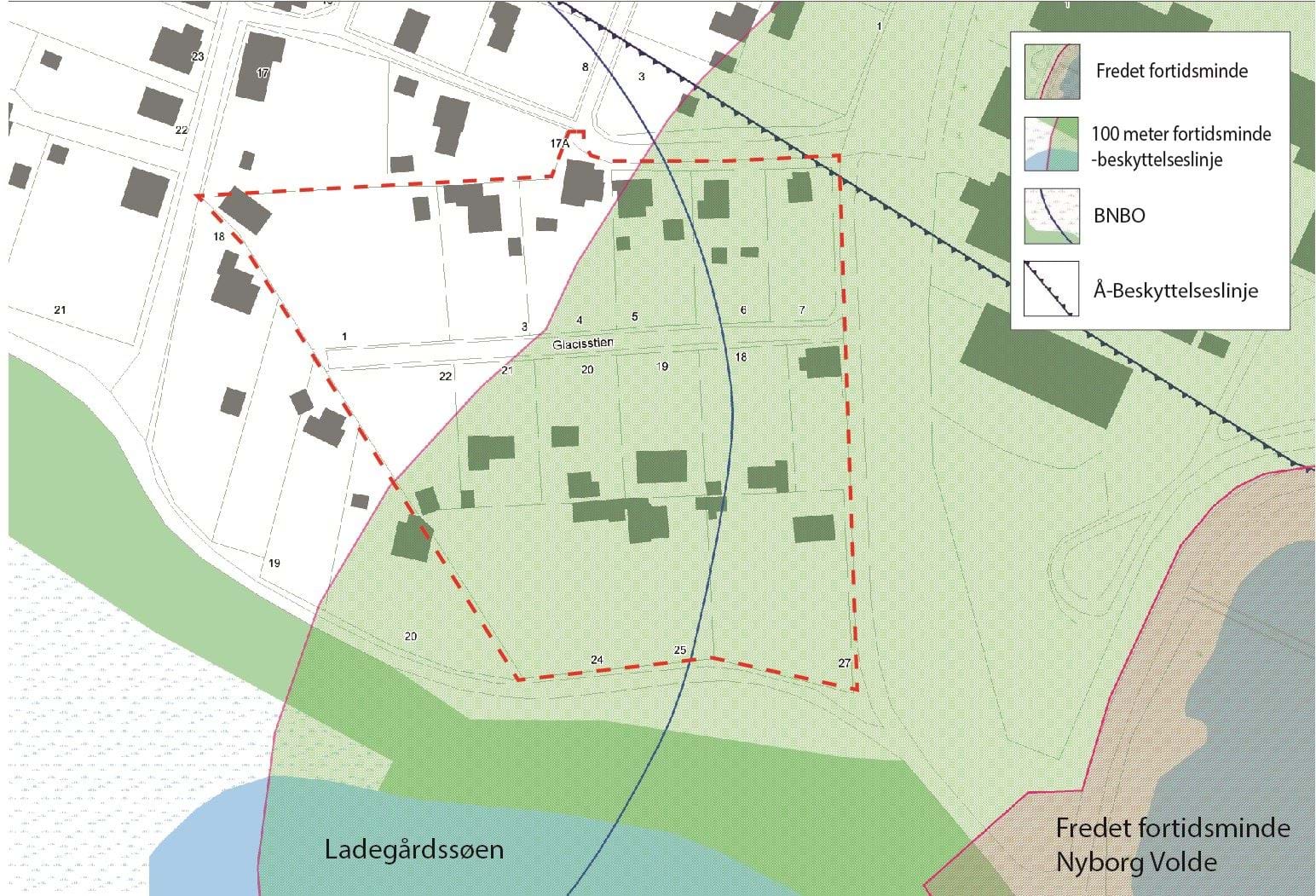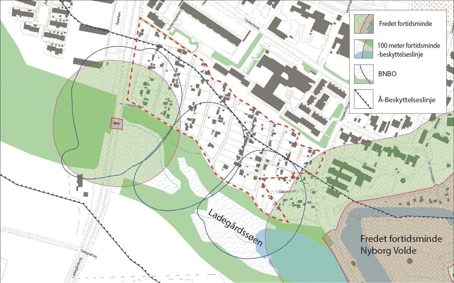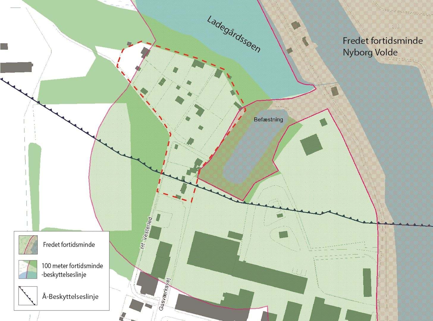 Hf. Vesterled berøres af flere flere beskyttelseslinjer, å-beskyttelseslinjen, 100 meter fortidsmindebeskyttelseslinjen og det fredede fortidsminde Nyborg Voldanlæg