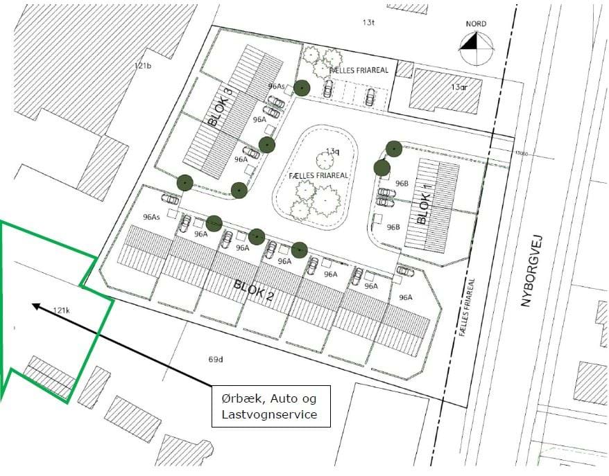 Udstykningsplan for projektområdet med indkørsel fra Nyborgvej samt placering af Ørbæk Auto og Lastvognsservice.