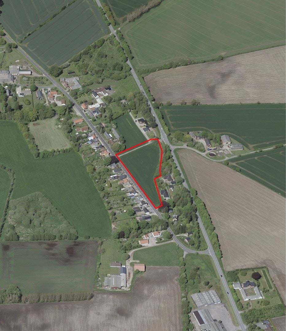 Skråfoto af lokalplanområdet, der er markeret med rød ramme på fotoet.