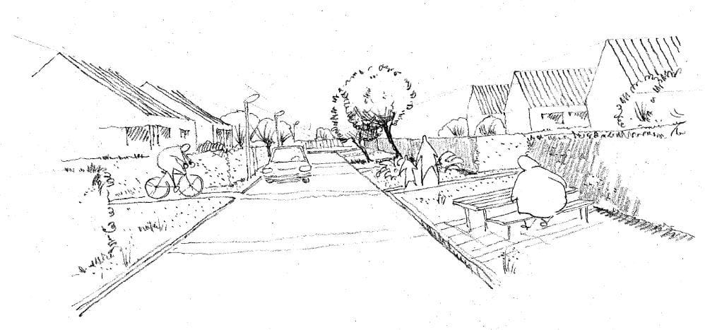 Figur 9: En boligvej i det nye boligområde. Boligernes facader ligger i en ensartet afstand fra boligvejen og skaber på den måde et intimt og imødekommende boligområde.