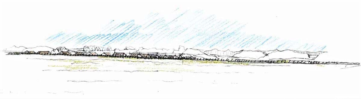 Figur 13: Boligområdet set fra landskabet øst for planområdet. Det beskyttede dige er med til at sløre byens kant mod det åbne land og skabe en fin arrondering af området.