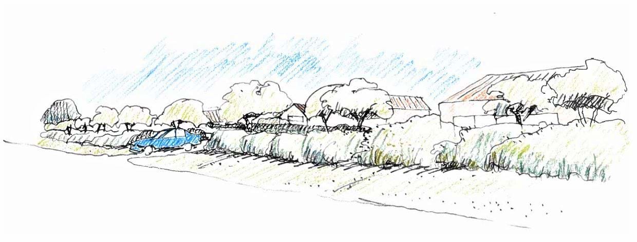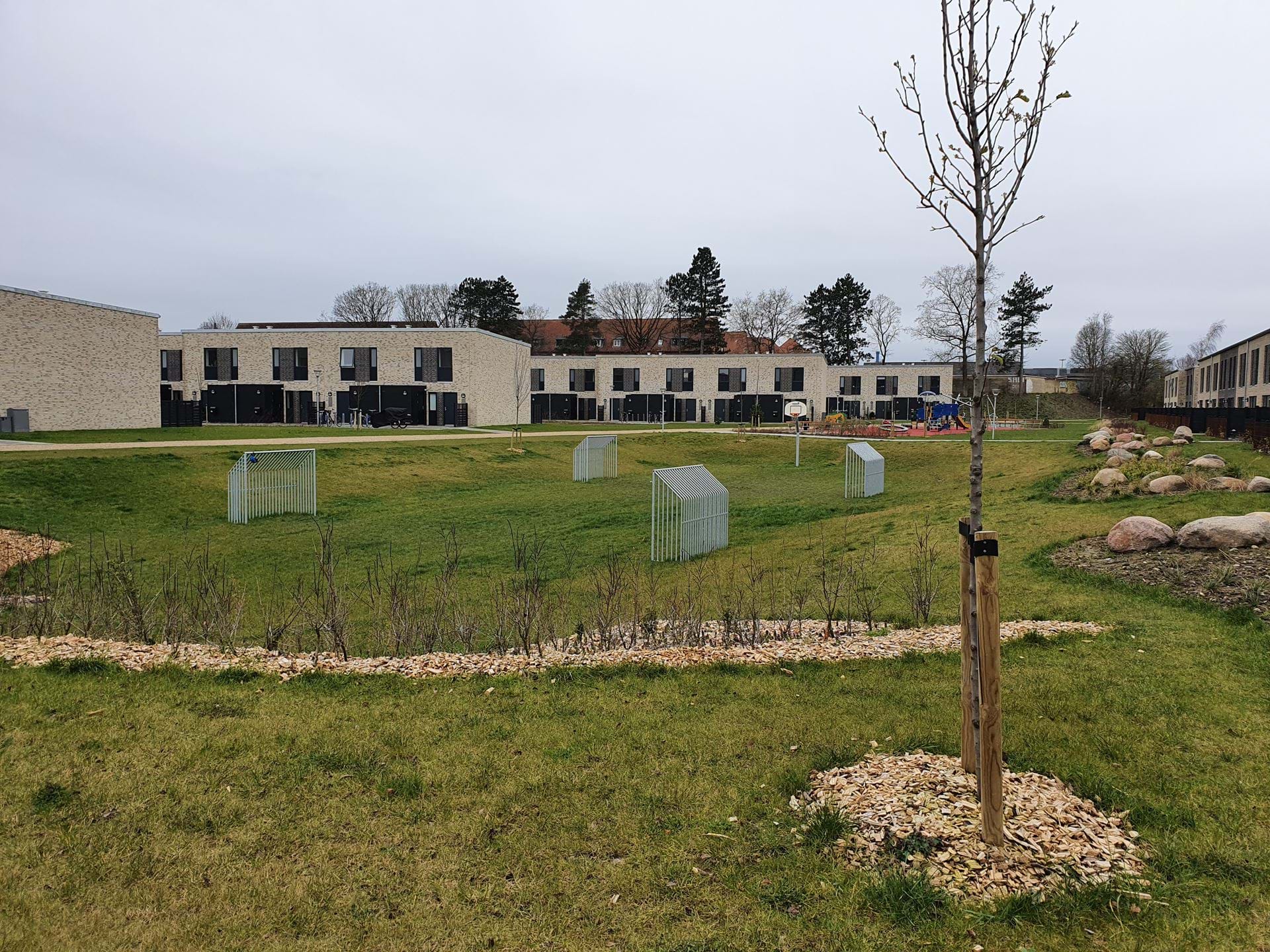 Figur 12: Grøn kile mellem boligerne. Det grønne område ligger som naturareal med spredt beplantning. Det er ikke hensigten at det skal fremstå pænt og nydeligt velplejet, men som et område, hvor planter og insekter kan sprede sig. Formålet med den grønne kile er både at skabe sammenhængende grønne omgivelser for boligområdet og skabe gode muligheder for naturlig nedsivning af regnvand.
