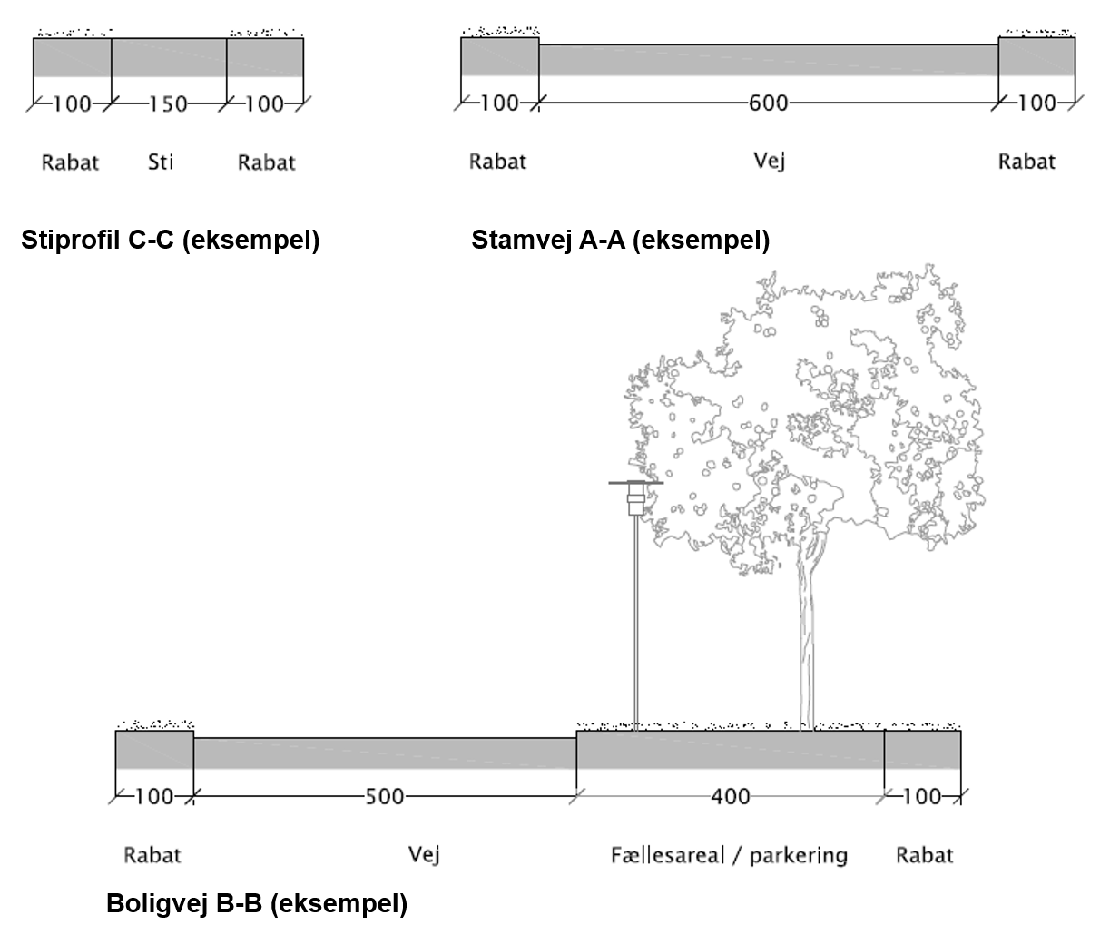Figur 16: Eksempel på profiler for hhv. stiudlæg, stamvejen og boligvejene. Planen fastsætter at kørebanebredden for vejudlæg skal være min. 5 m og max. 6 m.