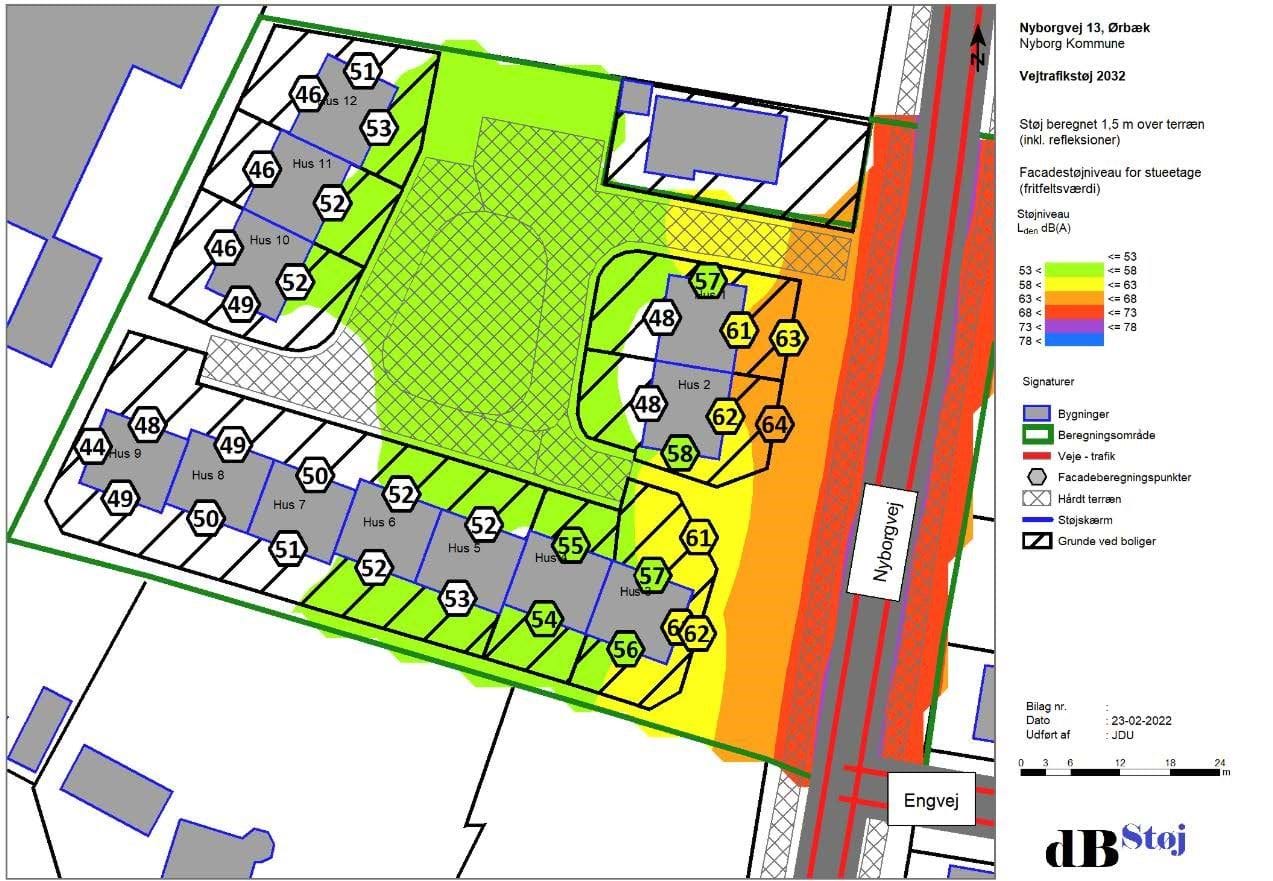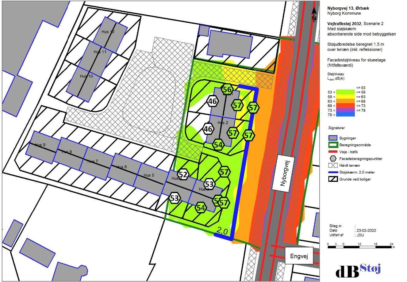 Det ses også, at det for scenarie 2 med en 2 meter høj støjskærm i 15 meters afstand fra Nyborgvej vil være muligt at overholde grænseværdien på 58 dB Lden ved både bygningsfacader samt i skelpunkter ved terræn.