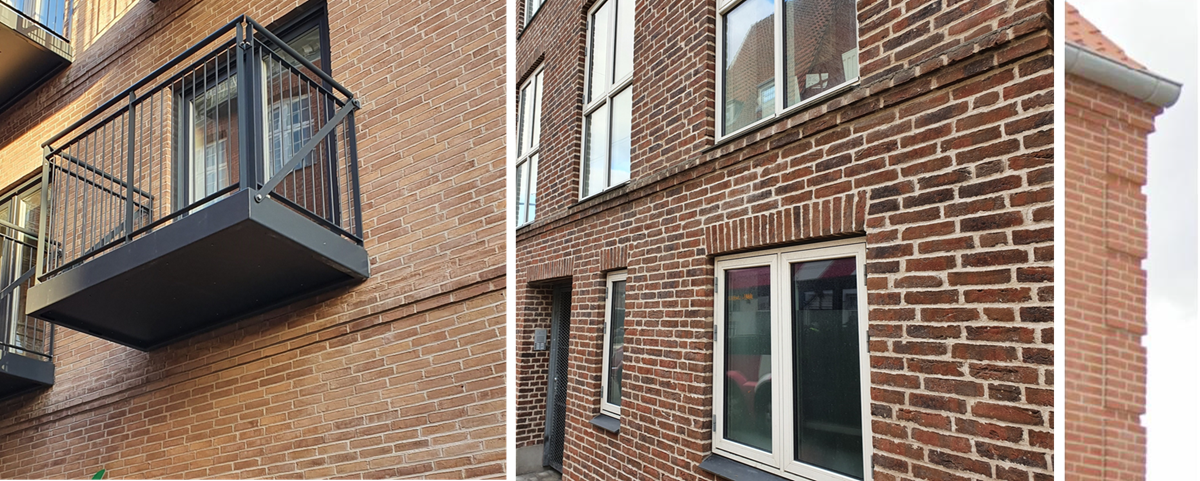 Figur: Referencebilleder for den nye bebyggelse. Eksemplerne viser, hvordan der i nybyggeri kan indarbejdes gesims i murværket der fremhæver etageovergange, hvordan der kan indarbejdes andre detaljer i murværket for at skabe variation, og hvordan åbne, frithængende altaner kan fremstå på nyt teglstensbyggeri.