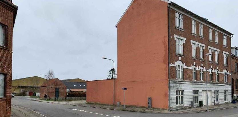 Figur: Visualisering (øverst) af, hvordan et nyt byggeri kan tage sig ud. Kig fra nord fra Vognmandsvej. Det er vigtigt at understrege, at det er en mulighed for, hvordan nybyggeriet kan se ud, men ikke nødvendigvis et udtryk for, hvad der bliver bygget. Nuværende forhold nederst.