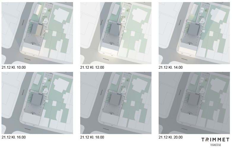 Diagrammet viser dels, at den eksisterende etageboligbygning kun i begrænsede perioder vil skygge for altaner og byhaver i den planlagte bygning. Dels, at den planlagte bygning vil give skyggevirkninger i haver øst for planområdet efter kl. 16 forår/efterår og hovedsageligt efter kl. 20 i sommerperioden. Den illustrerede skyggevirkning på nordøstlig nabo om eftermiddagen i december skyldes i væsentlig grad den eksisterende etagebygning.