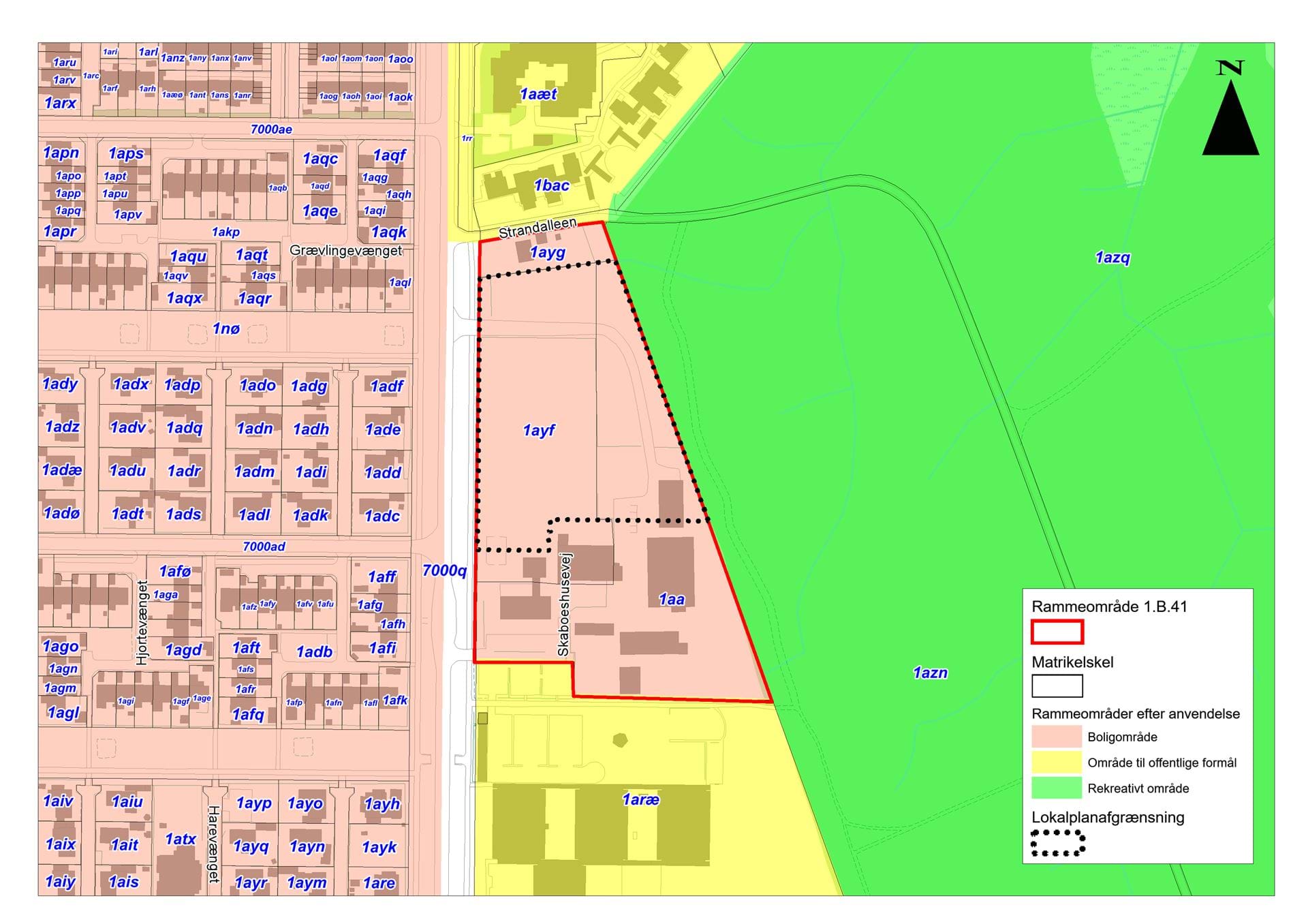 Figur 15: Afgrænsningen af rammeområde 1.B.41 ift. lokalplanområdet og den planlagte anvendelse på naboarealer.