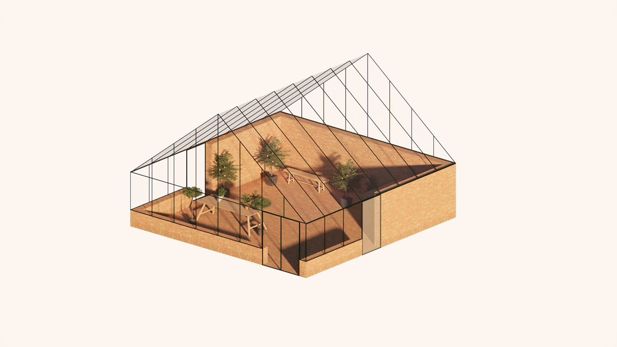 Figur 11: Illustration af et fælleshus placeret i det grønne bælte i delområde 2. Fælleshuset er vist med et let udtryk, hvor taget og en del af facaden er i glas, mens størstedelen af facaden er i mursten ligesom boligbebyggelsen i området. Bemærk , at visualiseringen blot er et eksempel på, hvordan et fælleshus kan tage sig ud.