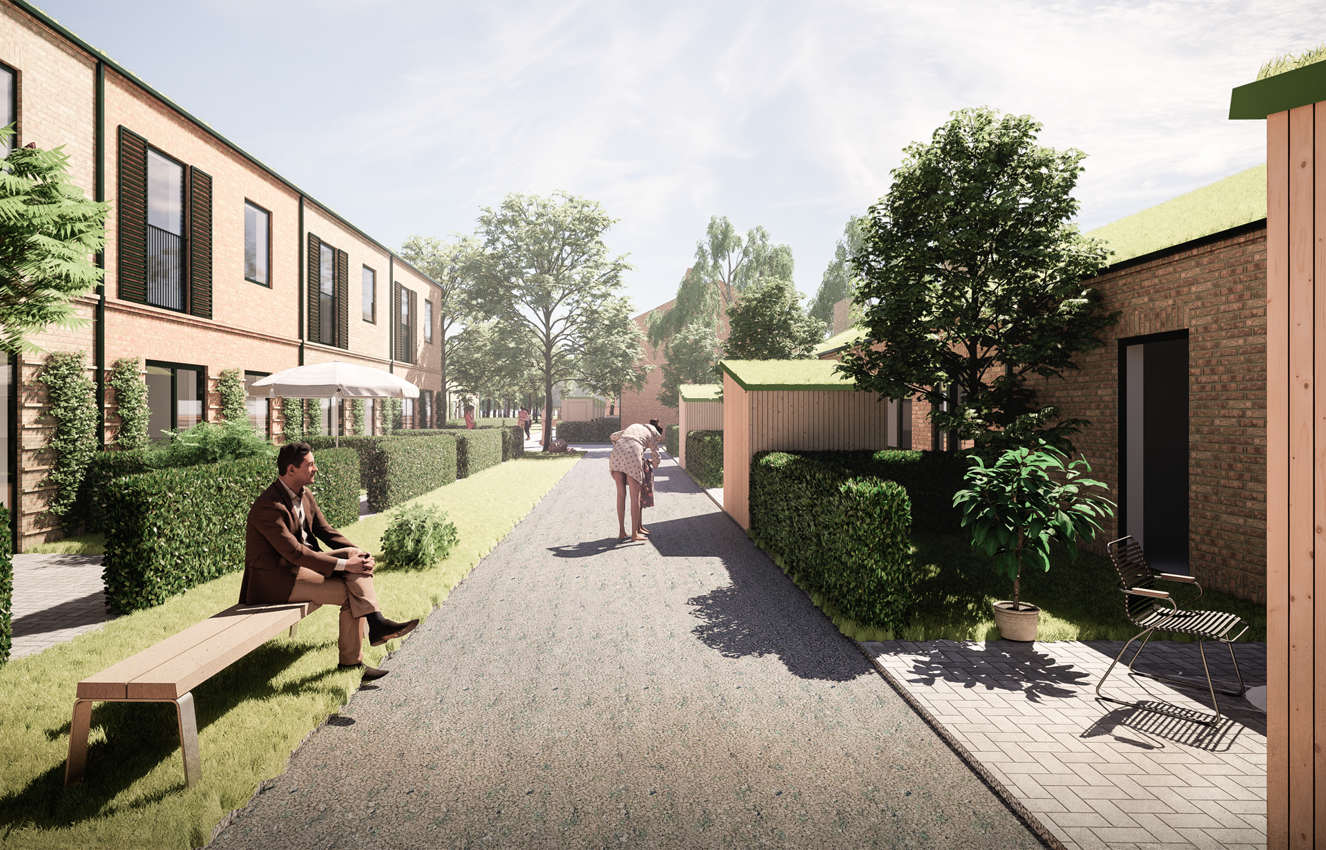 Figur 10: Byhuse arrangeret omkring et internt stiforløb med træer og mulighed for ophold. Langs den ene side af stierne ses beboernes ankomstside (th), hvor de private skure vil være med til at bryde uderummet op – både grundet skurenes form og stoflige overflader. På den anden side af stierne ses de private baghaver (tv), hvor beboerne har mulighed for at nyde godt af de sydvendte terrasser. Visualiseringen viser boliger i en og to etager som de kan komme til at se ud baseret på lokalplanens bestemmelser. Bemærk dog, at visualiseringen blot er et eksempel på, hvordan området og bebyggelsen kan tage sig ud.