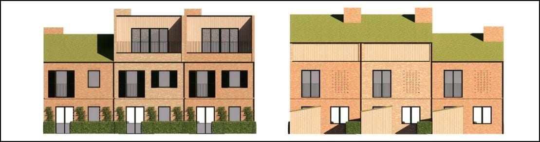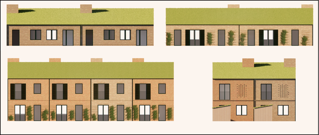 Figur 8: Facadeopstalter: Boliger i en og to etager. Planen kræver, at facader fremstår hovedsageligt i gule mursten med farvespil, og at der laves detaljer på facaden i form af muret stik og gesimser. Tagene begrønnes. Sekundære bygninger er her vist i træ.