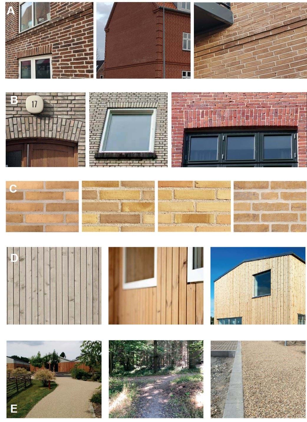 Figur 7: Referencebilleder for de nye boliger i området, detaljer: A) Gesims mellem etager og mellem tag og facade. B) Muret stik over vinduer. C) Mursten i gule og gulrøde nuancer. D) Træbeklædning, f.eks. til skure. og E) Stier i forskellig belægning.