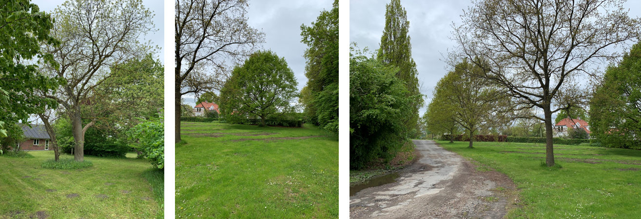 Figur 13: Træer der sikres mod fældning ved lokalplanen. Til venstre ses træet i den sydlige del af området, i midten det store markante egetræ ved nordligt skel og til højre rækken af egetræer langs den nordlige side af den nuværende adgangsvej.