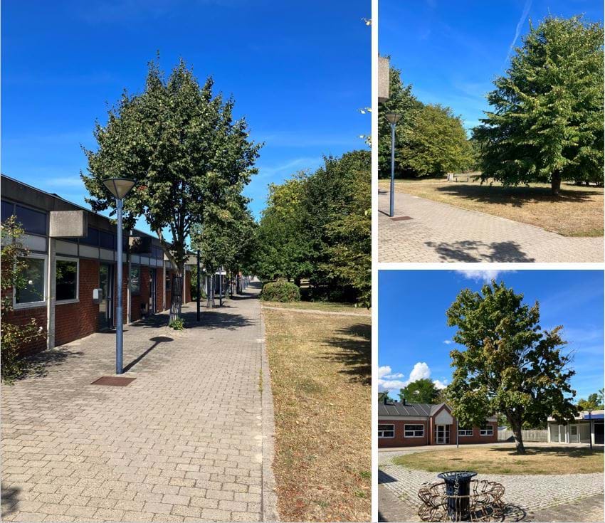 Lokalplanområdet indeholder flere store træer, både sat i række for at markere stiforbindelser gennem området og som solitære træer, der er med til at definere centrale pladser og som skaber skygge og mulighed for ophold.