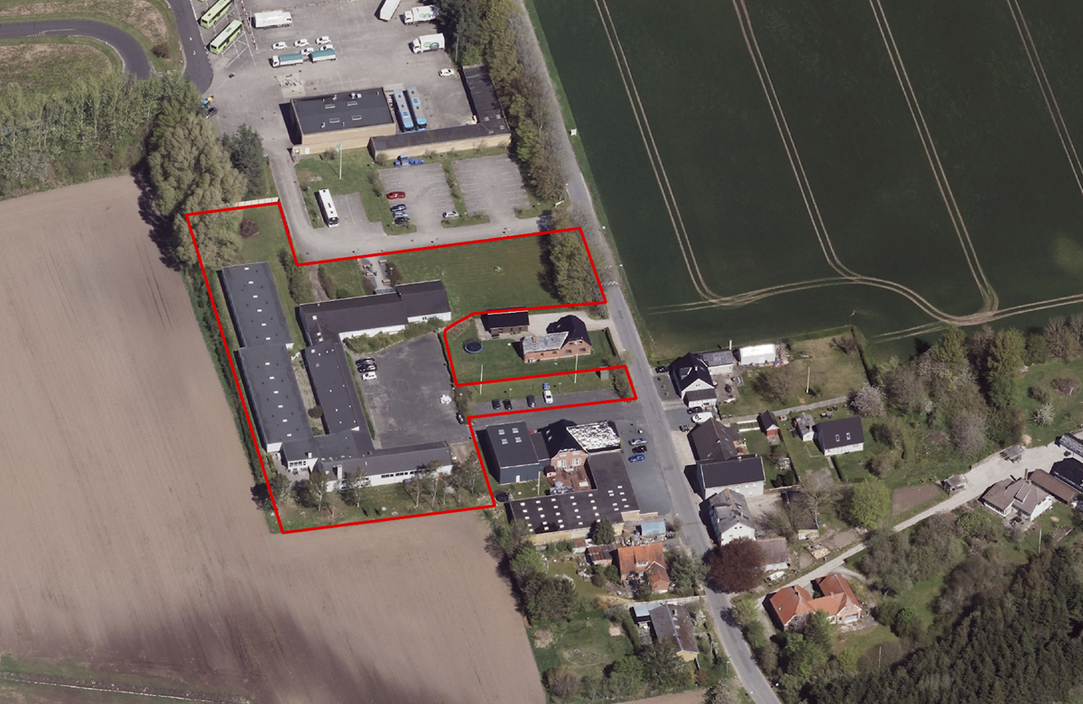Skråfoto af lokalplanområdet, der er markeret med rød ramme på fotoet.
