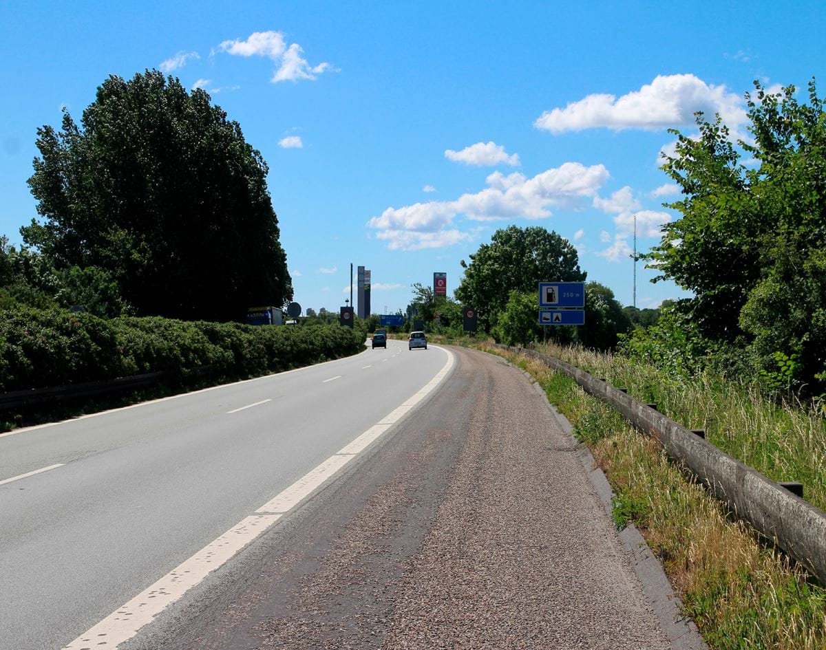 Kig til pylonerne fra motorvej E20 i østgående retning. Den planlagte pylon står umiddelbart til venstre for den eksisterende pylon ved OK tanken. Motorvejens krumning betyder, at pylonen kun kortvarigt vil blokere udsigten til den eksisterende pylon.