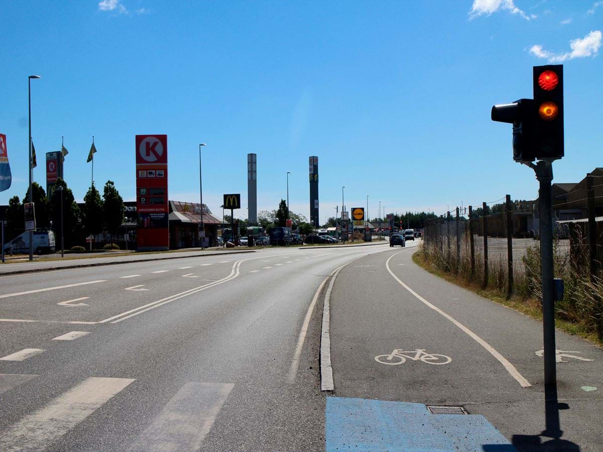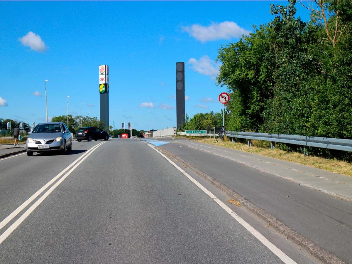 Herover ses pylonen mellem eksisterende skiltning ved Storebæltsvej - kig mod øst fra krydset Storebæltsvej/Banegårdsalleen.