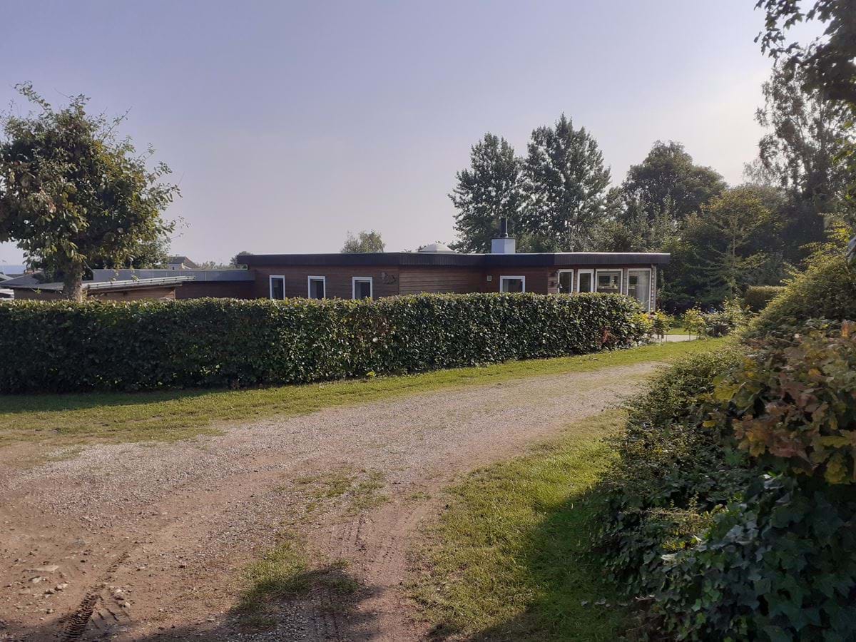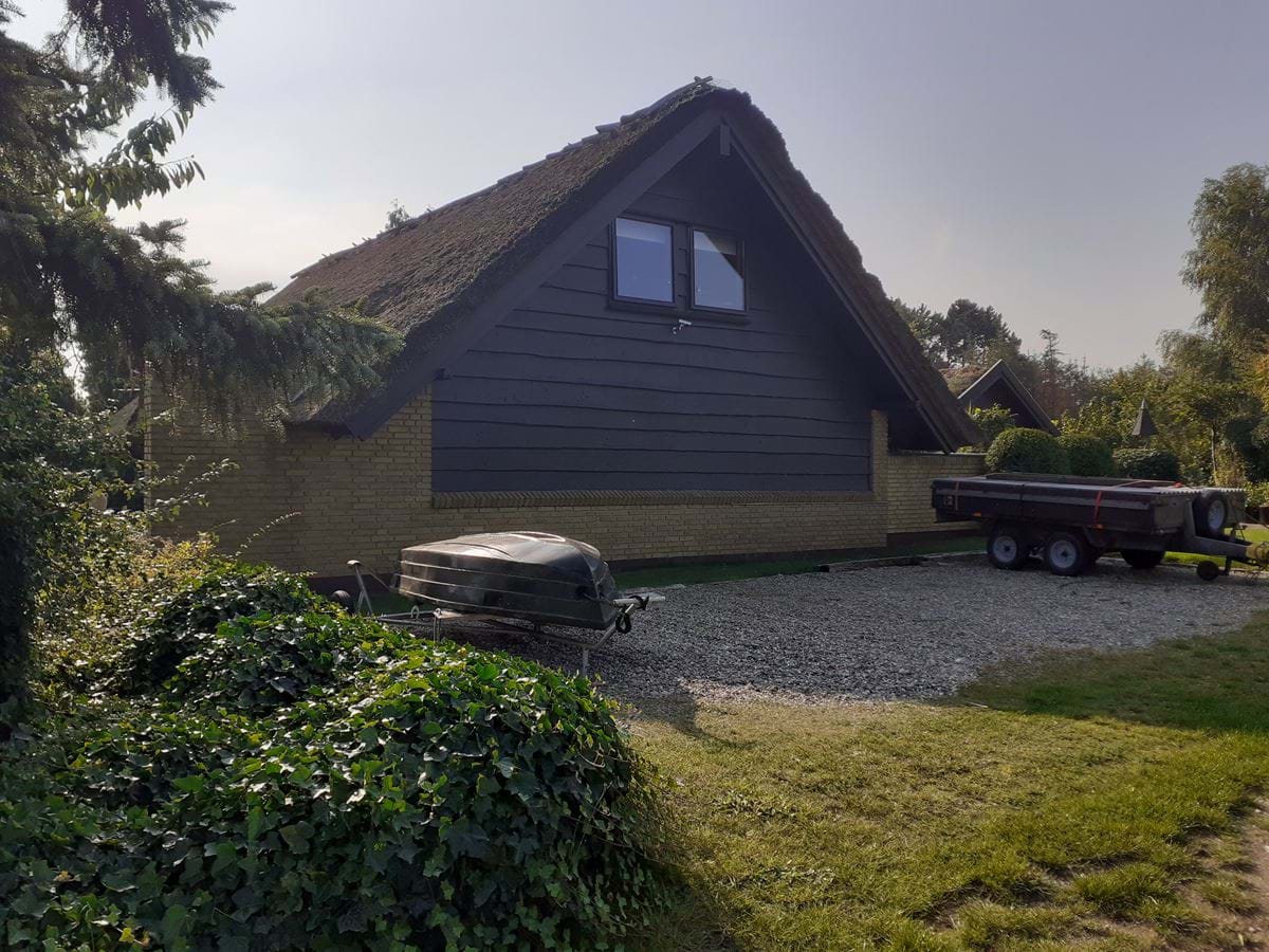 Et af de nyere sommerhuse, hoved huset er lavet med stråtag, og sidebygningen som kan skimtes i baggrunden med grønt tag.