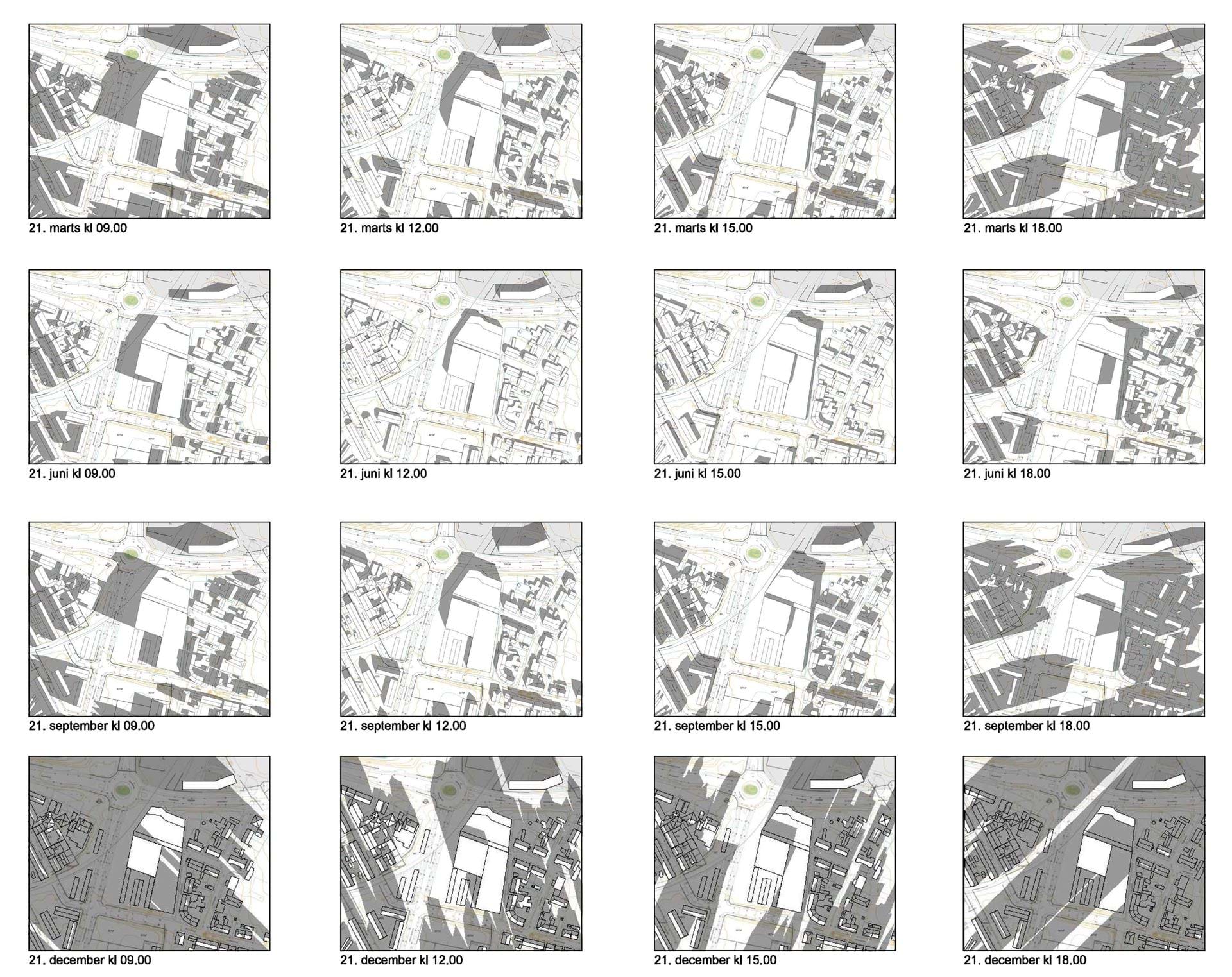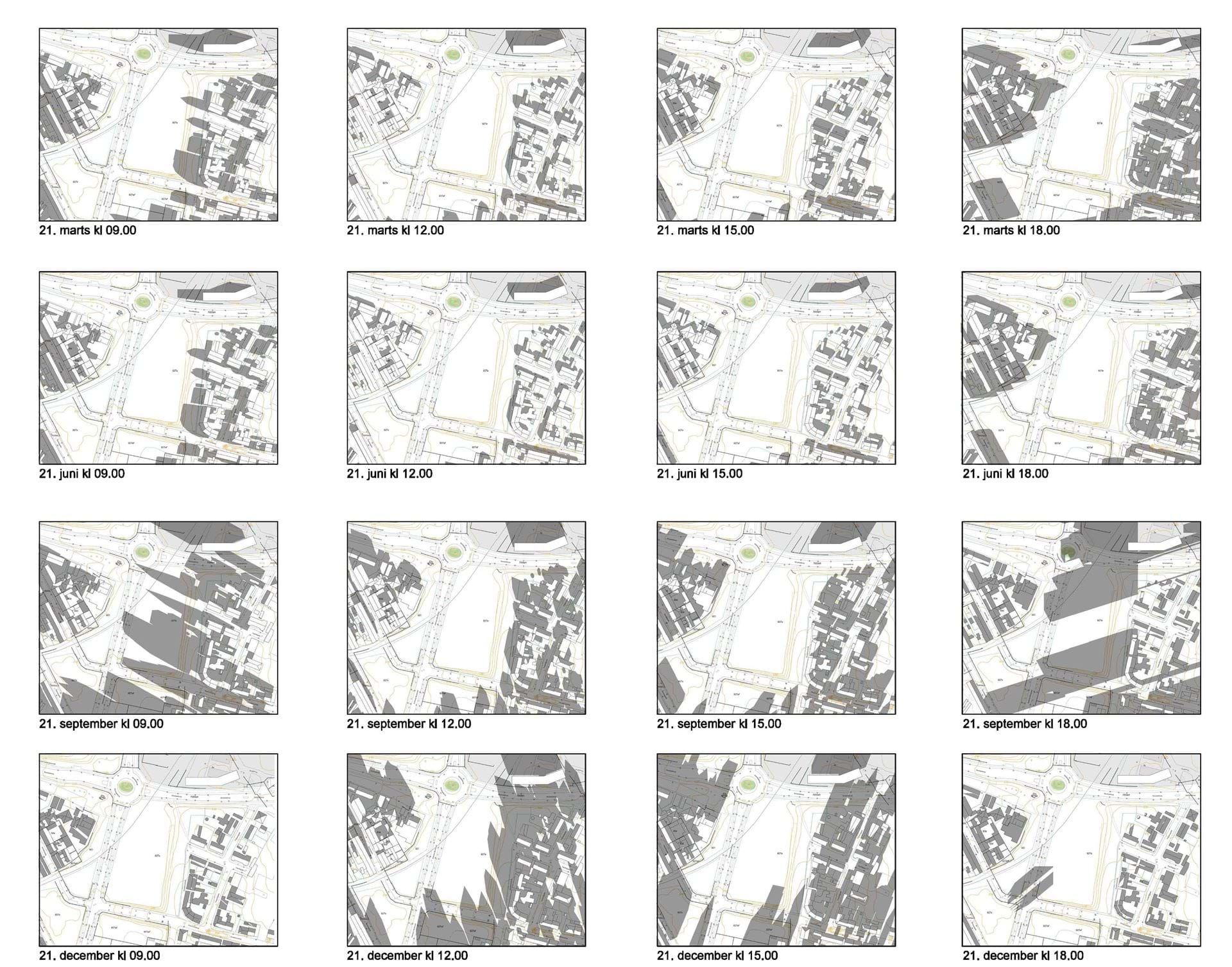 Da lokalplanen kun fastlægger ny bebyggelse på byggefeltsniveau, er det i forbindelse med lokalplanen ikke muligt at lave skyggestudier af det konkrete kommende byggeri. Nedenstående studier er derfor lavet ud fra en max. volumenstudie, lavet ud fra et scenarie hvor alle byggefelter blev bygget fyldt ud. Dette er dog ikke muligt med lokalplanen da det kun er muligt at bygge 5600 m2 etageareal, og den udlagte byggevolumen, der er udlagt med byggefelterne, er større. Nedenstående skyggestudie er derfor en stres belastning af området.