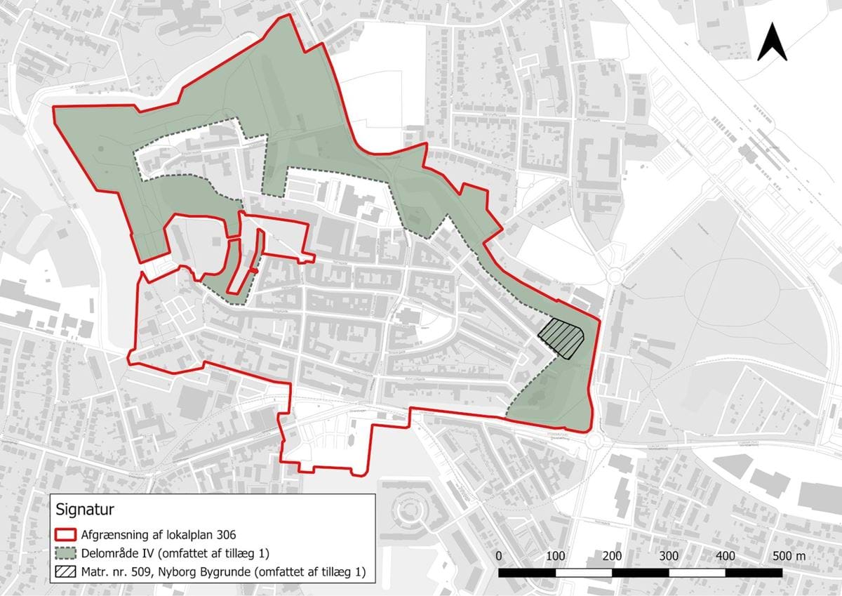Bemærk at tillæg nr. 1 til lokalplan 306 kun omfatter ejendomme indenfor delområde IV, og herudover forholder sig specifikt til matr. nr. 509, Nyborg Bygrunde, som i dag huser Nyborgs Teater- og Kulturhus, Bastionen.