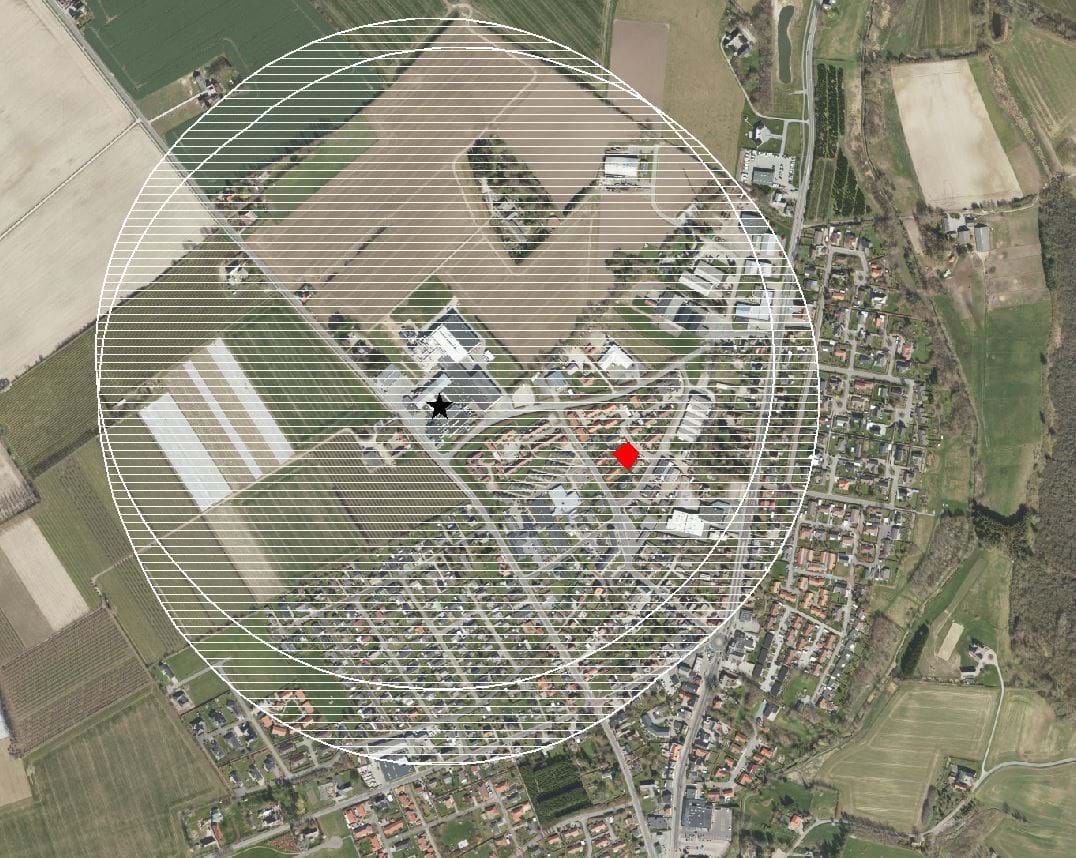 Oversigtskort, der viser placeringen af risikovirksomhederne (stjerne), deres konsekvenszoner (hvid skravering) og lokalplan 326 (rød markering).