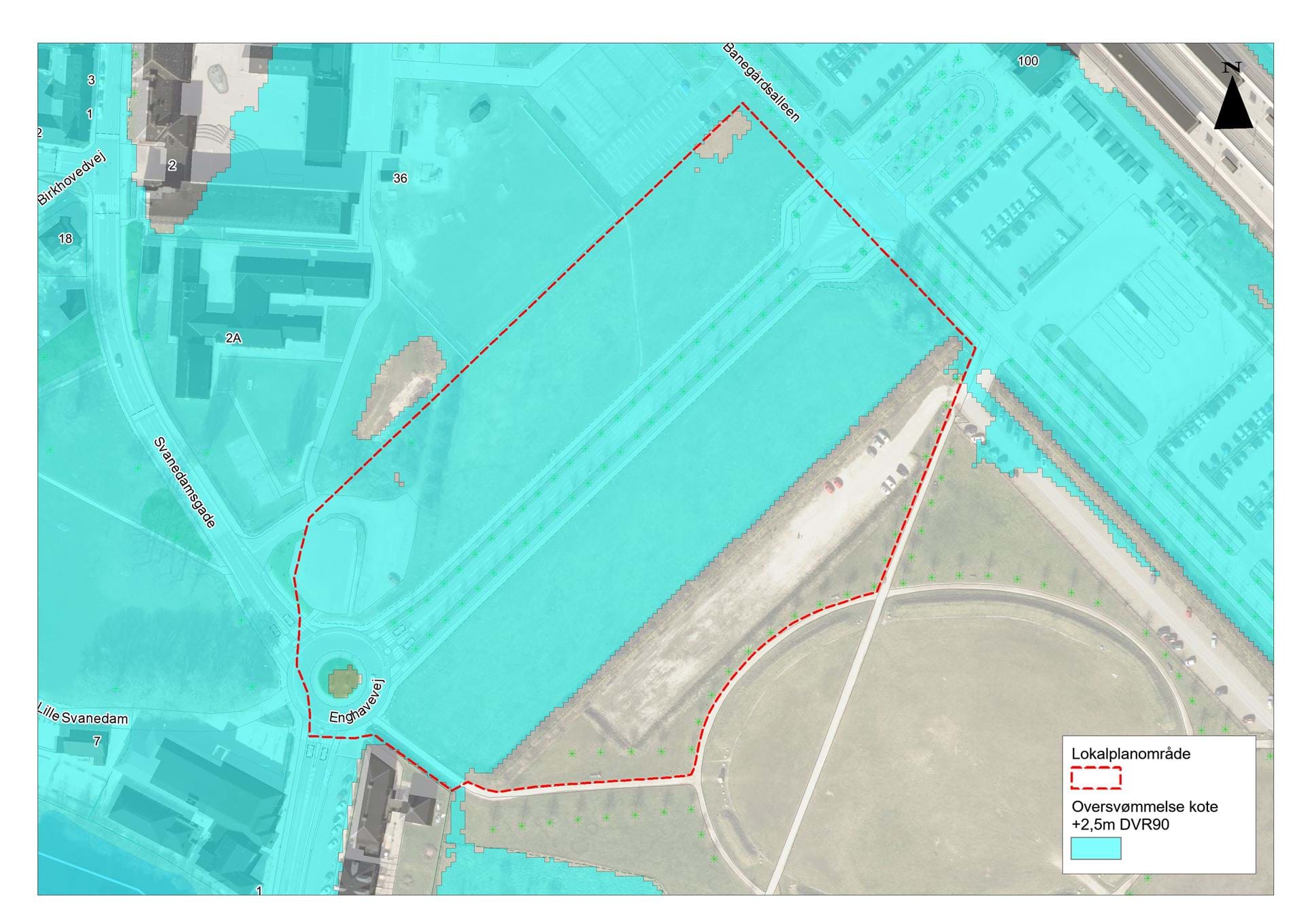 Figur: Oversvømmede arealer i tilfælde af en ekstremhændelse om ca. 100 år svarende til vandstandstigning på +2,50 m DVR90. Størstedelen af planområdet vil blive oversvømmet ved sådan en hændelse. Derfor er afværgeforanstaltninger nødvendige.