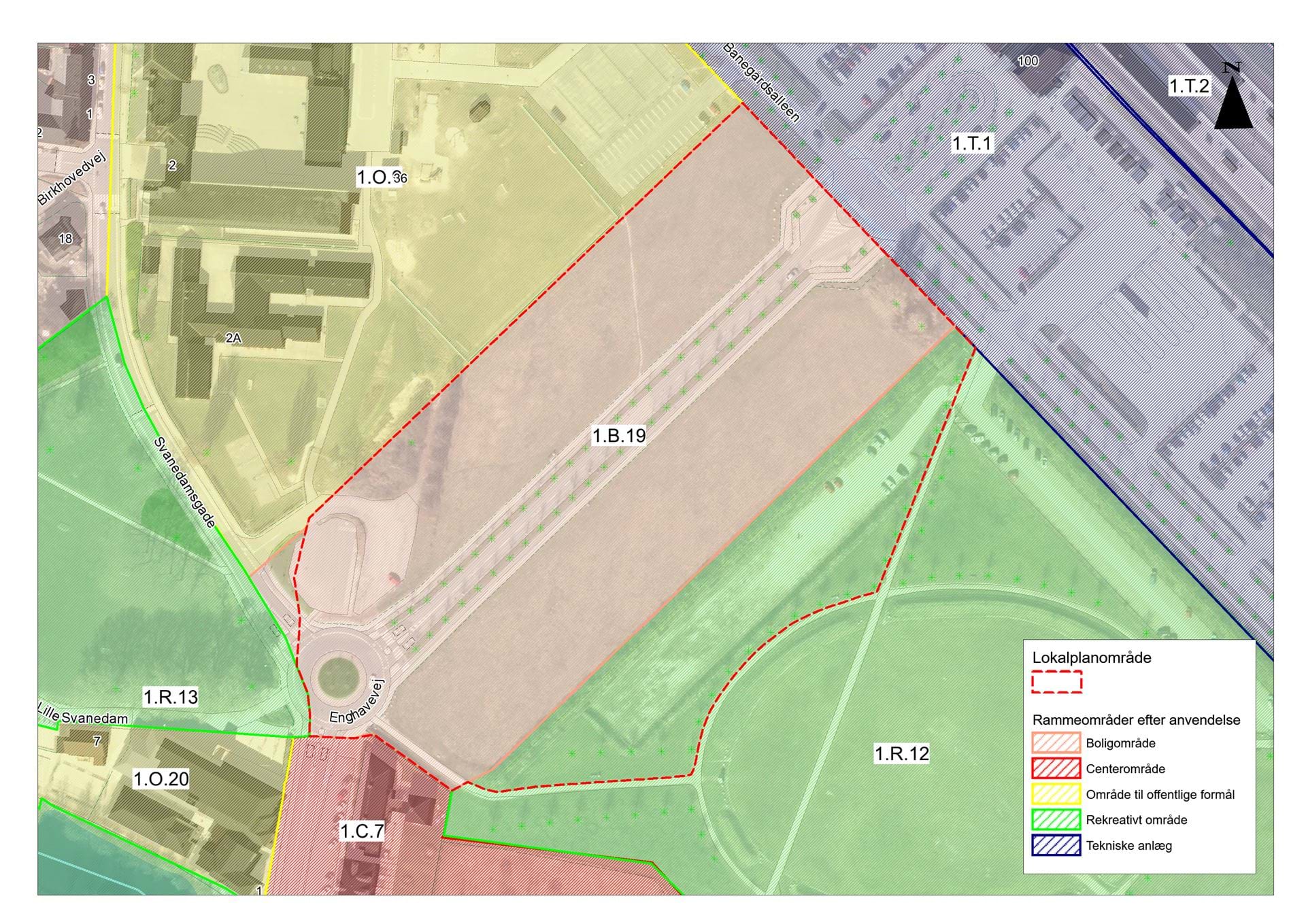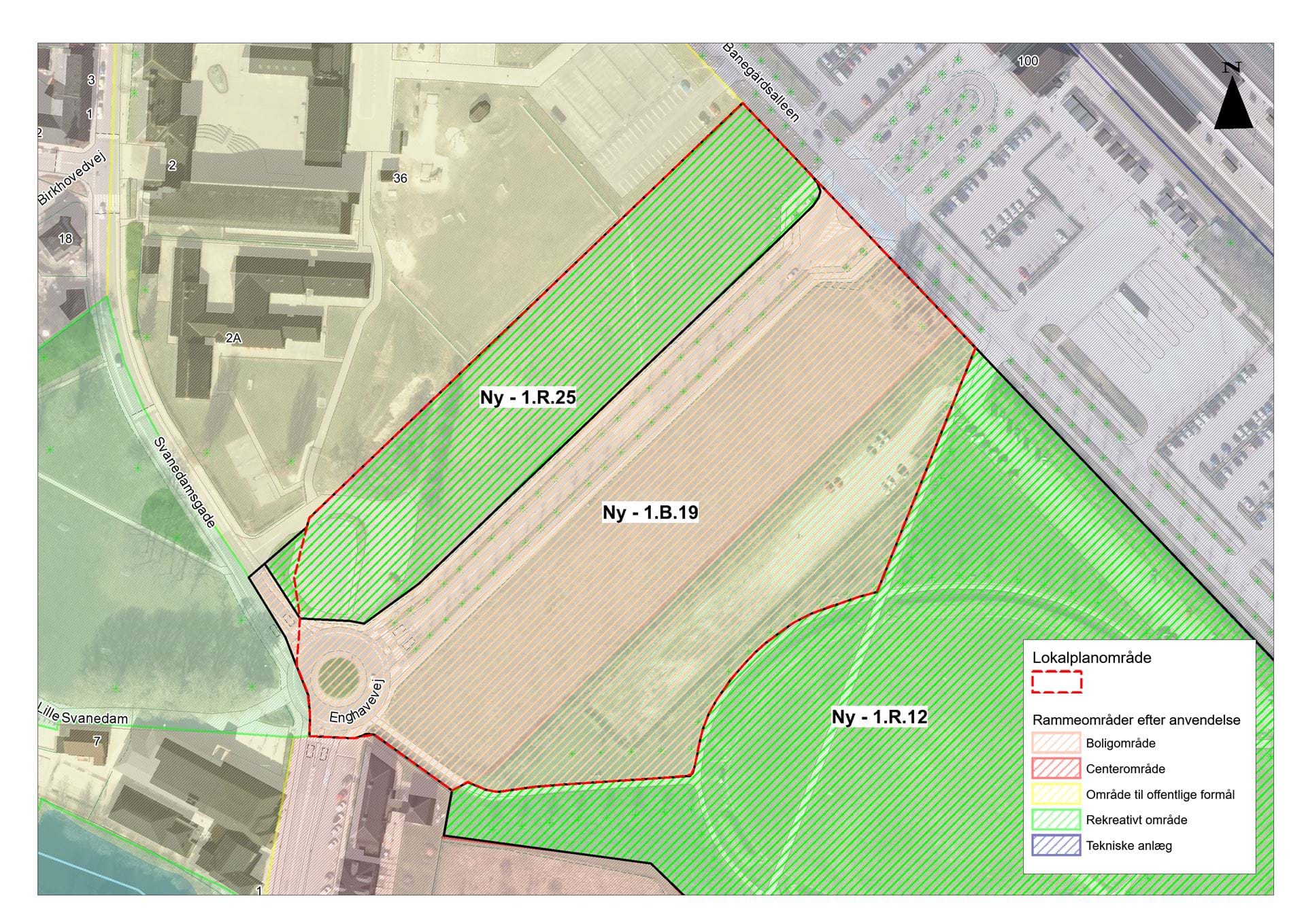 Lokalplanen dækker områder, der er omfattet af ramme 1.B.19 og 1.R.12 i Kommuneplan 2017. Ramme 1.B.19 udlægger områderne langs Banegårdsalléen til etageboligbebyggelse: Max. 9000 etagemeter i form af punkthuse i max. 3 etager og med en højde på max. 12,5 m. Ramme 1.R.12 udlægger området syd for ramme 1.B.19 til et større rekreativt område, byparken i Svanedammen. Det fremgår af rammen, at der kan opføres mindre bygninger i tilknytning til områdets drift og funktion f.eks. musikpavillon, naturskole eller lign., og at stiforbindelser skal opretholdes.
