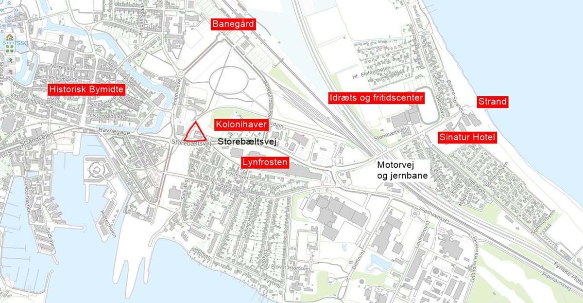 Oversigtskort, der viser lokalplanområdets placering i det østlige Nyborg. Området ligger langs med Storebæltsvej og tæt på den historiske bymidte.