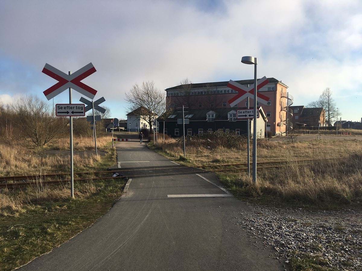 Foto af den eksisterende sti for gående og cyklister, som løber på den østlige side af lokalplanområdet. Forbindelsen kobler boligområdet i Knudshovedkarteret med blandt andet midtby, skoler og stationen. Herudover ses jernbanesporet, der benyttes til godstransport 1-2 gange ugentligt.