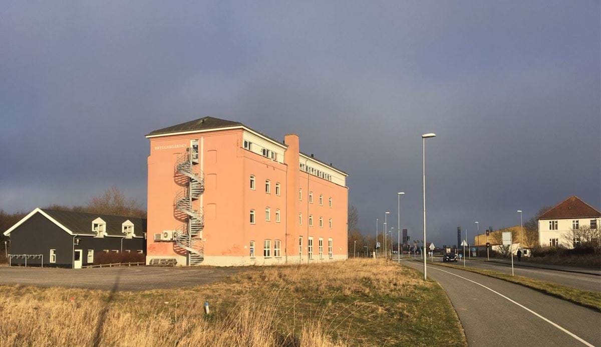 Foto af den eksisterende bebyggelse på Bryggerivej 1-3. Billedet er taget indefra byen og mod øst.