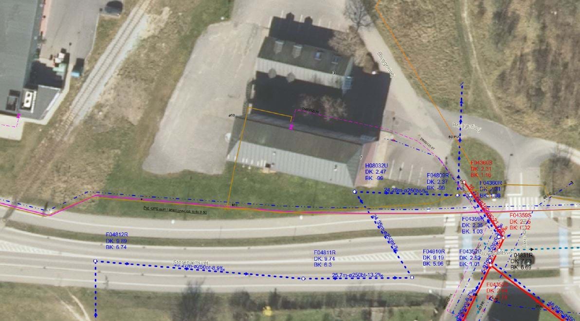 Oversigtskort, der illustrer forskellige rørføringer i og omkring lokalplanområdet.